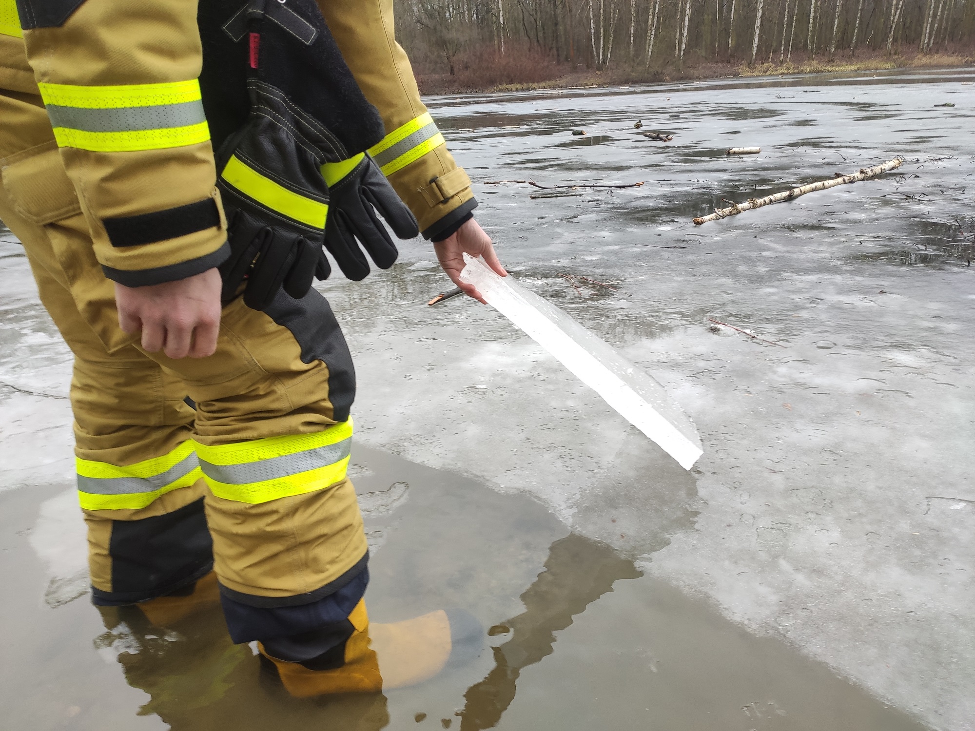 - Podchodzimy powoli na czworaka lub przesuwając się na brzuchu w okolice przerębla, zachowując szczególną ostrożność. Jeśli czujemy, że lód jest za cienki, zaczyna pękać, przerywamy swoje działanie i oczekujemy na przyjazd służb.