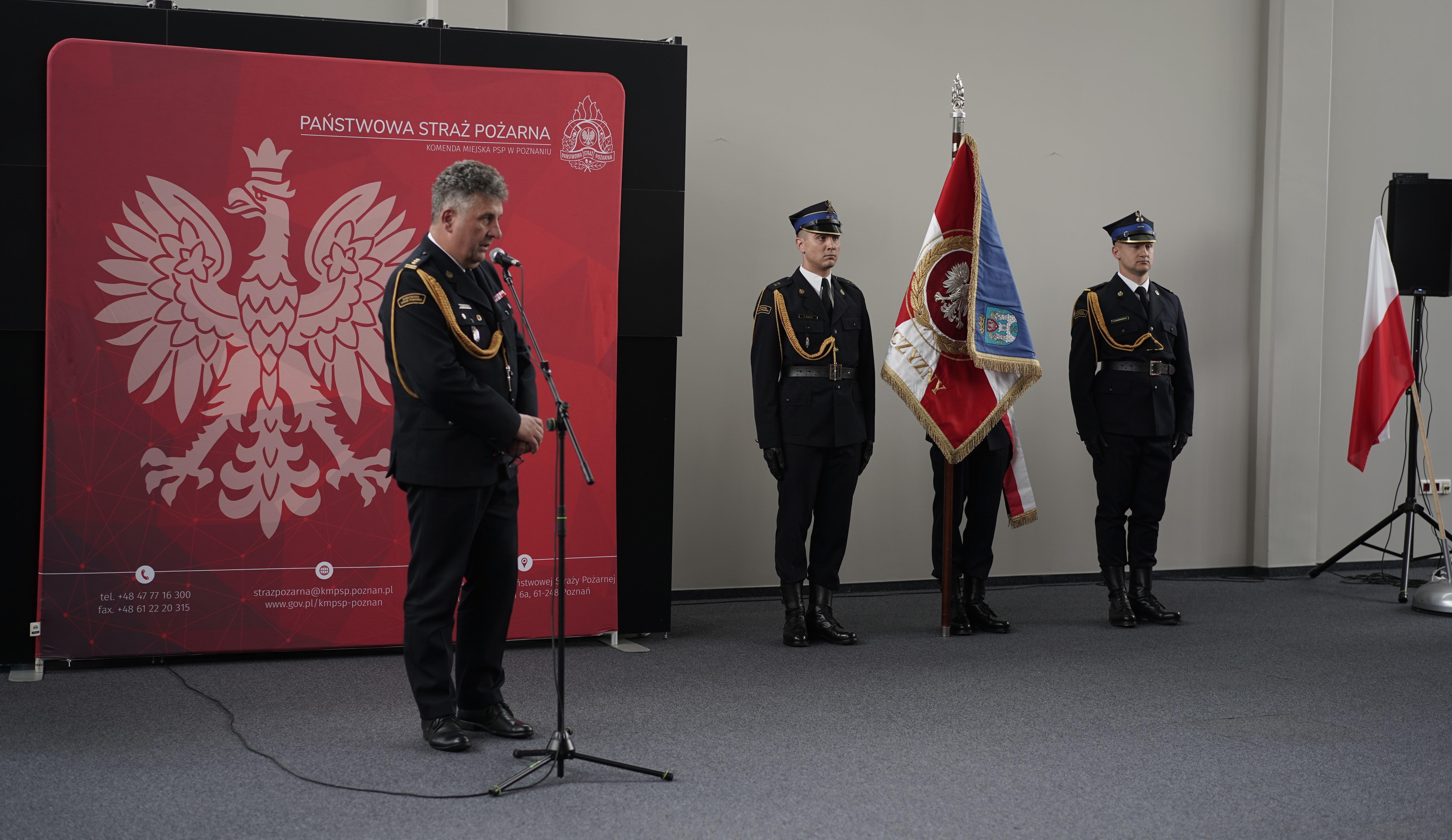 Ślubowanie przyjął Komendant Miejski Państwowej Straży Pożarnej w Poznaniu st. bryg. Jacek Michalak w obecności Zastępcy Komendanta Miejskiego st. bryg. Damiana Jankowiaka oraz p.o. Zastępcy Komendanta Miejskiego st. bryg. Grzegorza Banaszaka. W zbiórce wzięła udział kadra kierownicza Komendy Miejskiej PSP w Poznaniu.