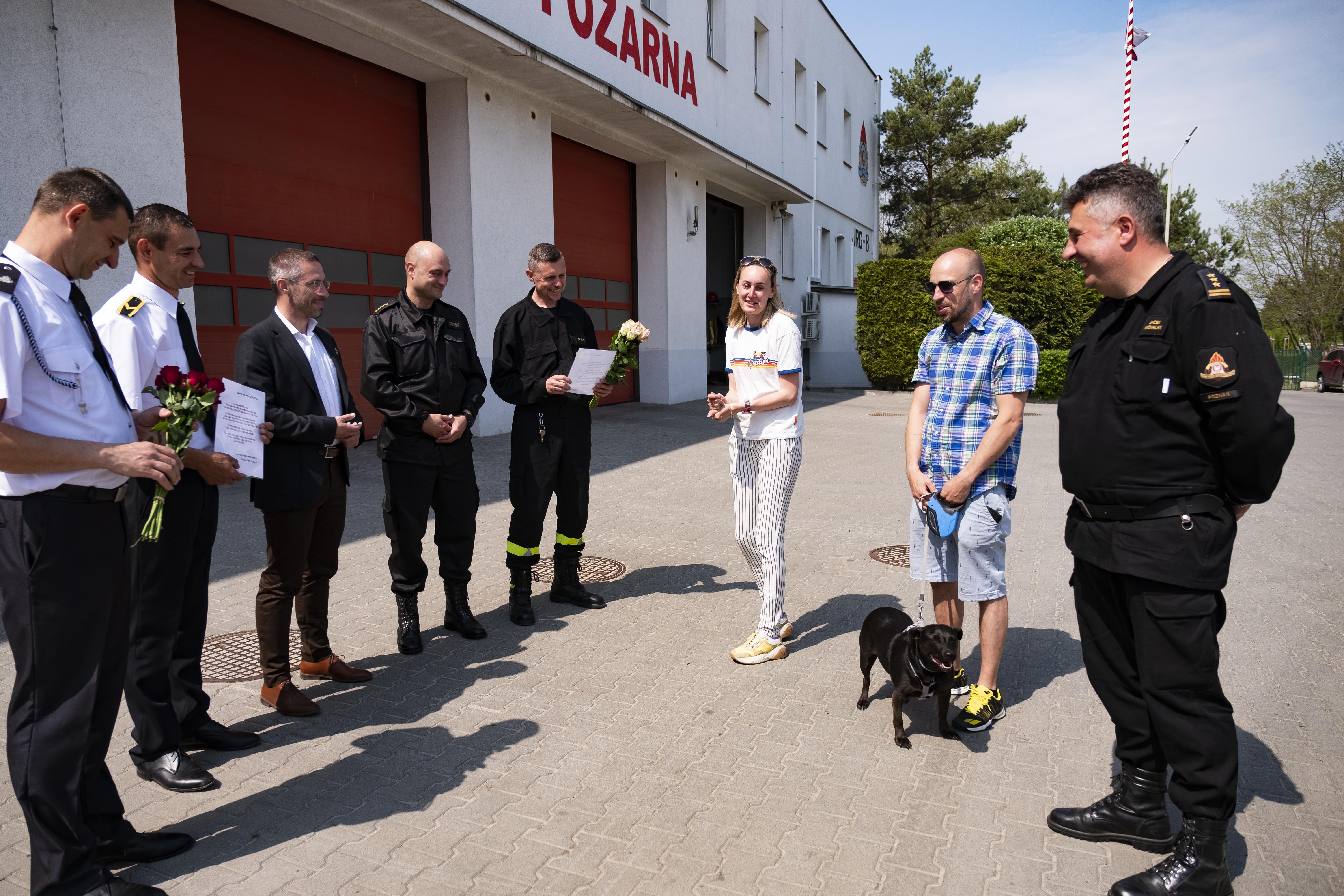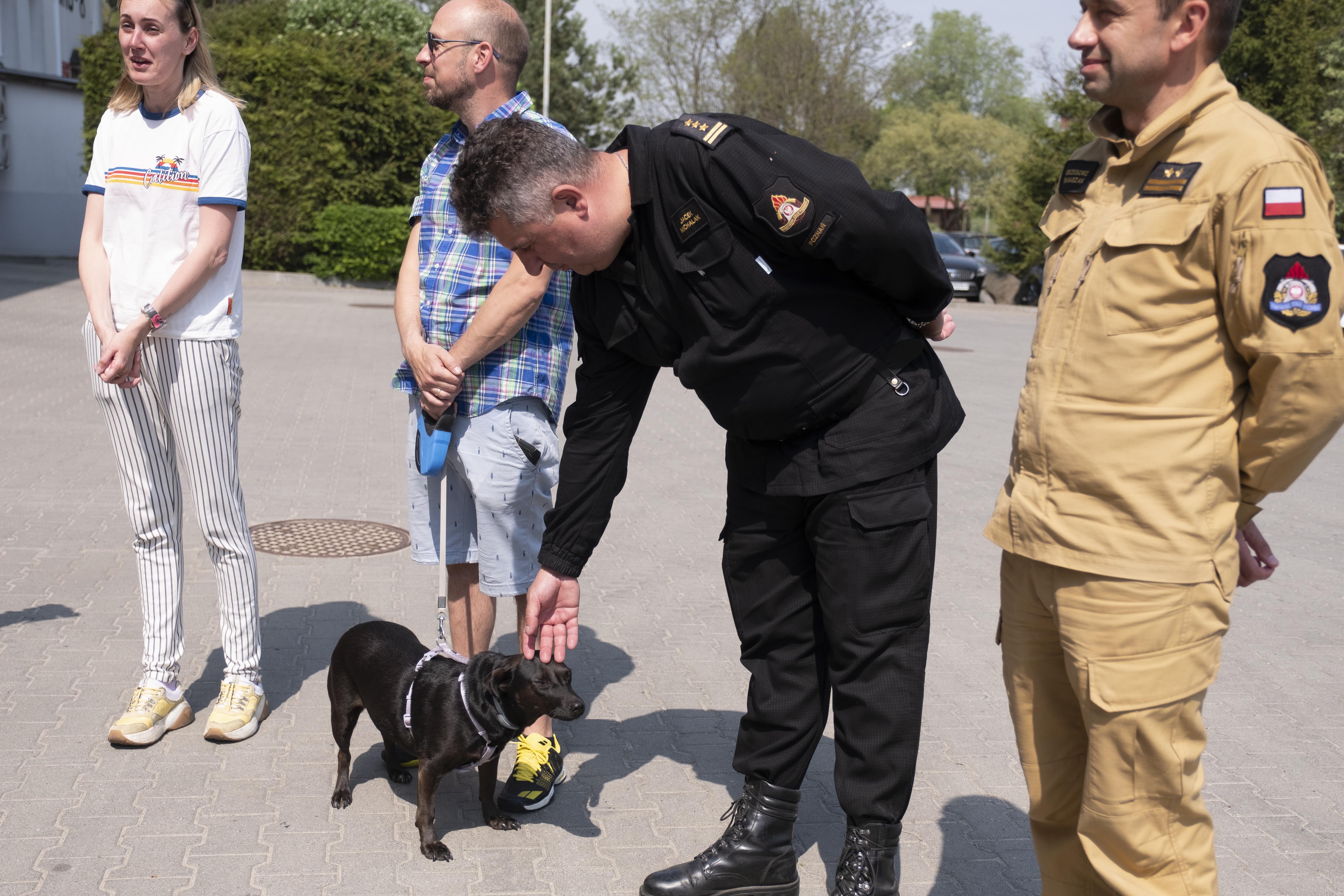 Podczas wizyty miało też miejsce bardzo miłe wydarzenie, a mianowicie właściciele suczki Szumi, przybyli podziękować za jej uratowanie. Przypomnijmy, że 22 kwietnia 2022 roku, dzięki ogromnemu zaangażowaniu i determinacji strażaków JRG 8 oraz druhów OSP Promnice, przy wsparciu strażaków JRG 4, Straży Gminnej z Suchego Lasu oraz właścicieli, uratowano Szumi, która wbiegła do lisiej nory i nie mogła się już z niej wydostać. Wielogodzinne działania na szczęście zakończyły się sukcesem, a suczka, co widać na z zdjęciach z wizyty, ma się dobrze.