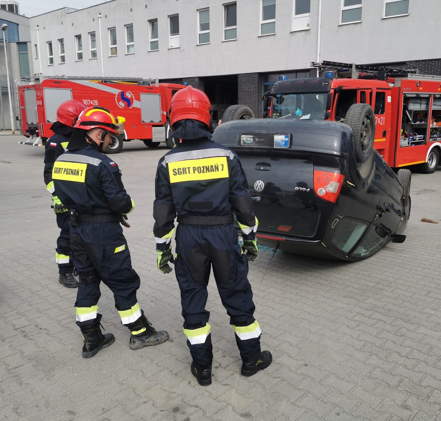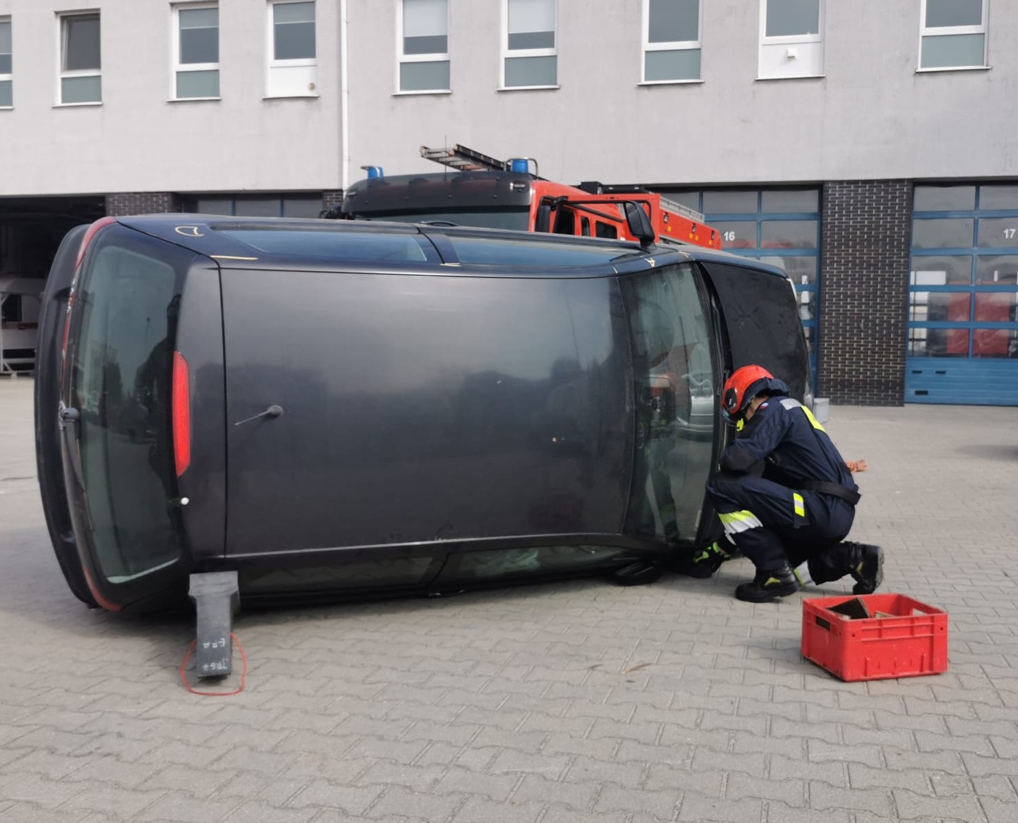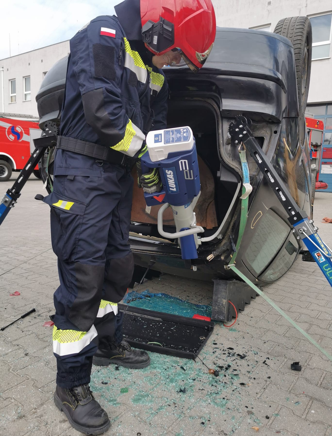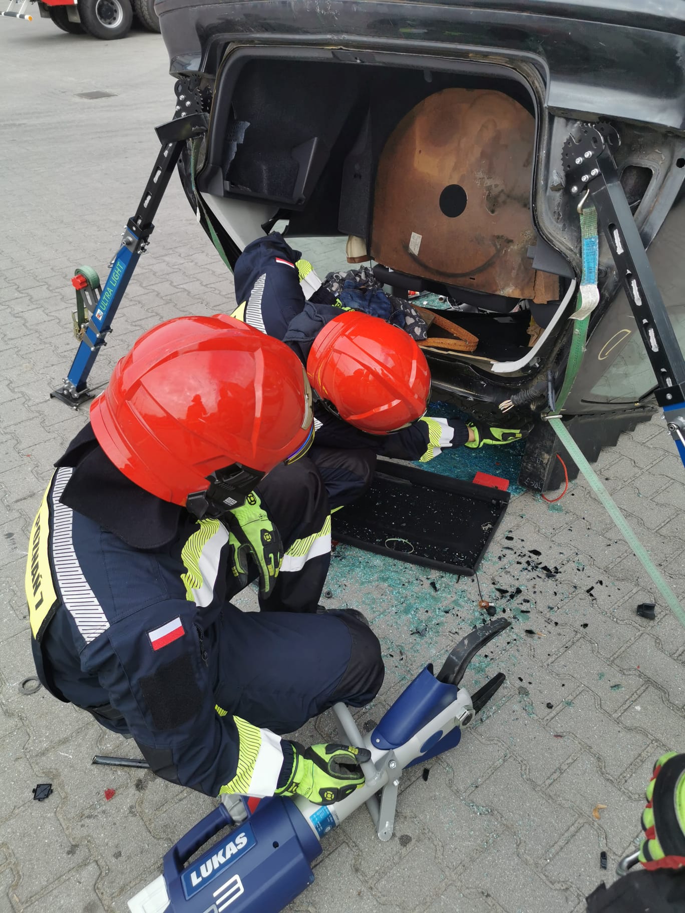 W przypadku pojazdu na dachu przećwiczono także metodę tunelowania, czyli - w tym przypadku - wykonanie przestrzeni niezbędnej do ewakuacji kierowcy ku tyłowi pojazdu. Wszystkie zadania wykonano przy użyciu elektrycznego sprzętu hydraulicznego.