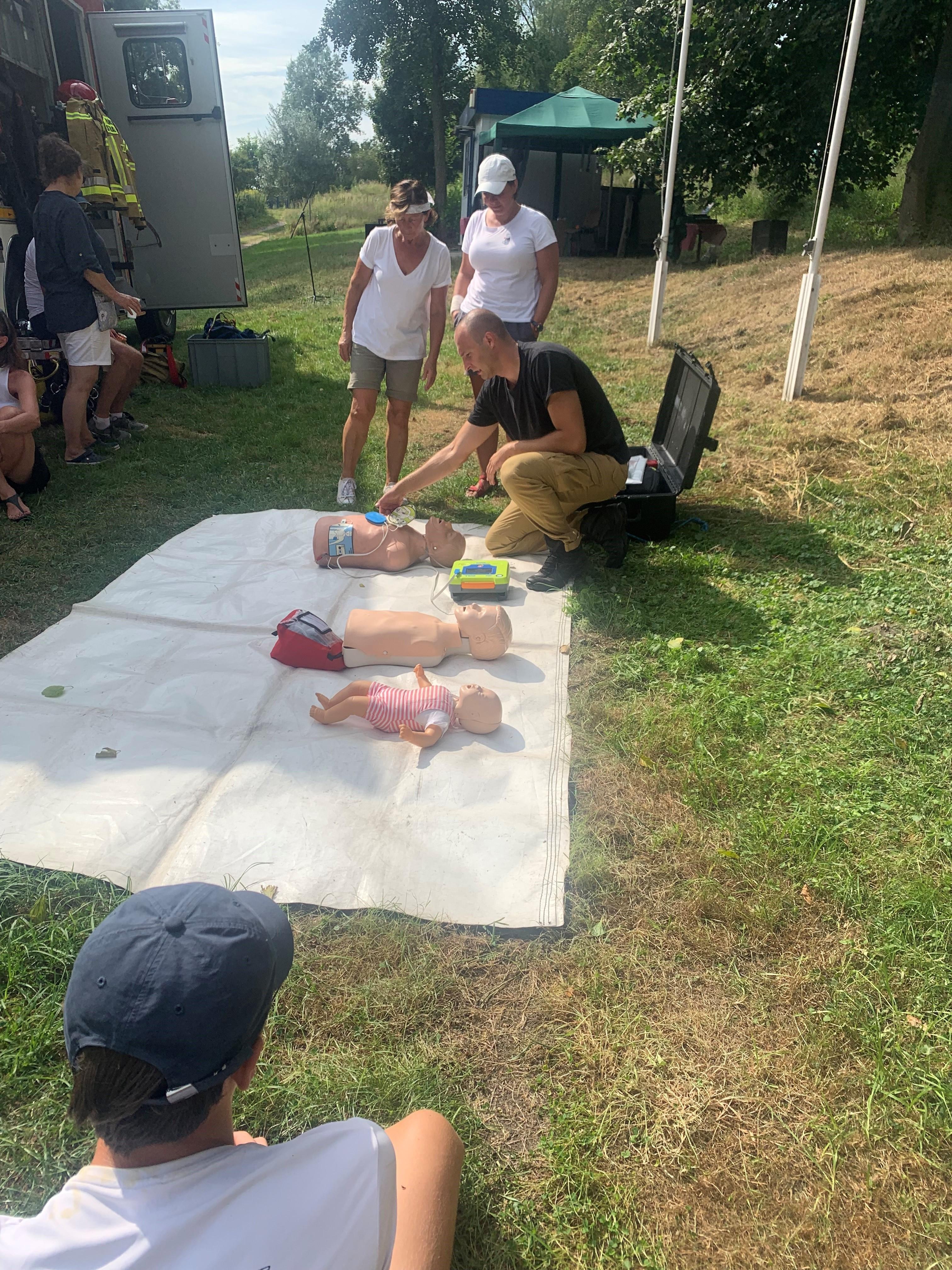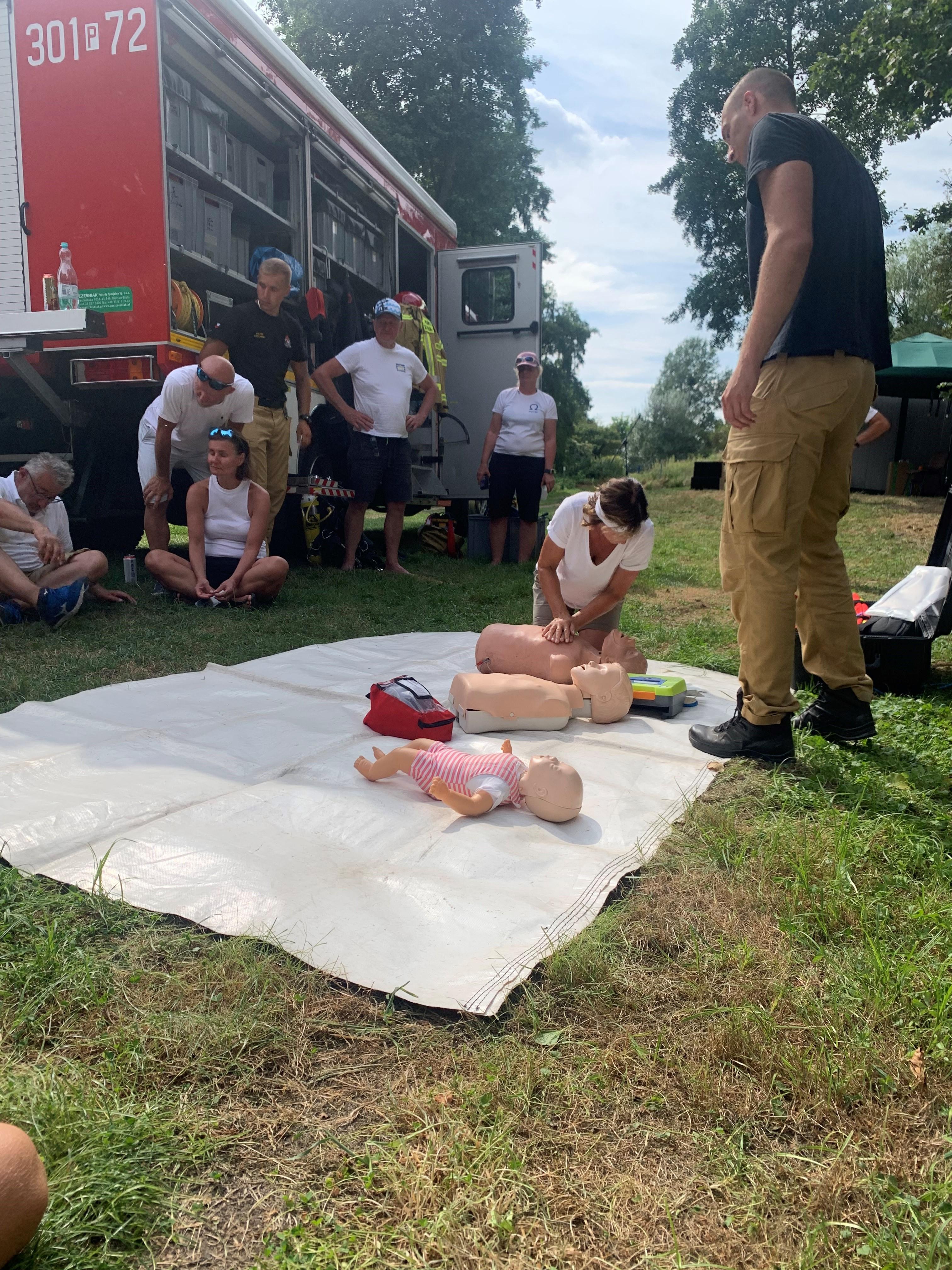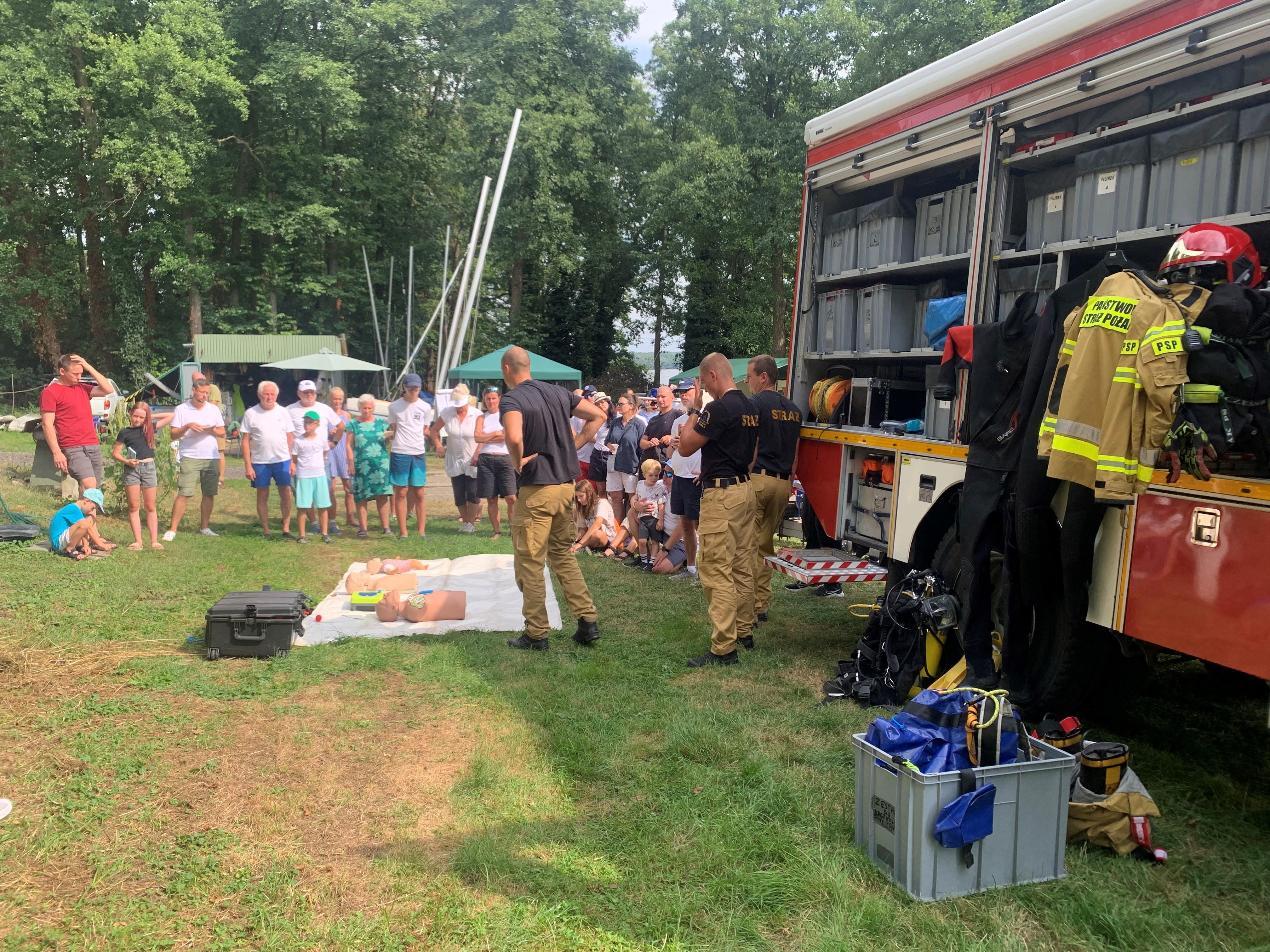 Strażacy opowiedzieli uczestnikom regat o zasadach działania grupy wodno-nurkowej oraz zaprezentowali sprzęt będący na jej wyposażeniu. Tematem przewodnim były natomiast ćwiczenia z udzielania pierwszej pomocy poszkodowanym w stanie zagrożenia życia lub zdrowia. Zajęcia odbywały się na fantomach przeznaczonych do resuscytacji, symulujących osobę dorosłą, dziecko i niemowlę. Uczestnicy ćwiczeń mogli dodatkowo zapoznać się przenośnym urządzeniem do defibrylacji (AED), jak i również przećwiczyć resuscytację z jego wykorzystaniem. Warsztaty cieszyły się dużym zaangażowaniem i pozytywnym odbiorem przez członków klubu.
