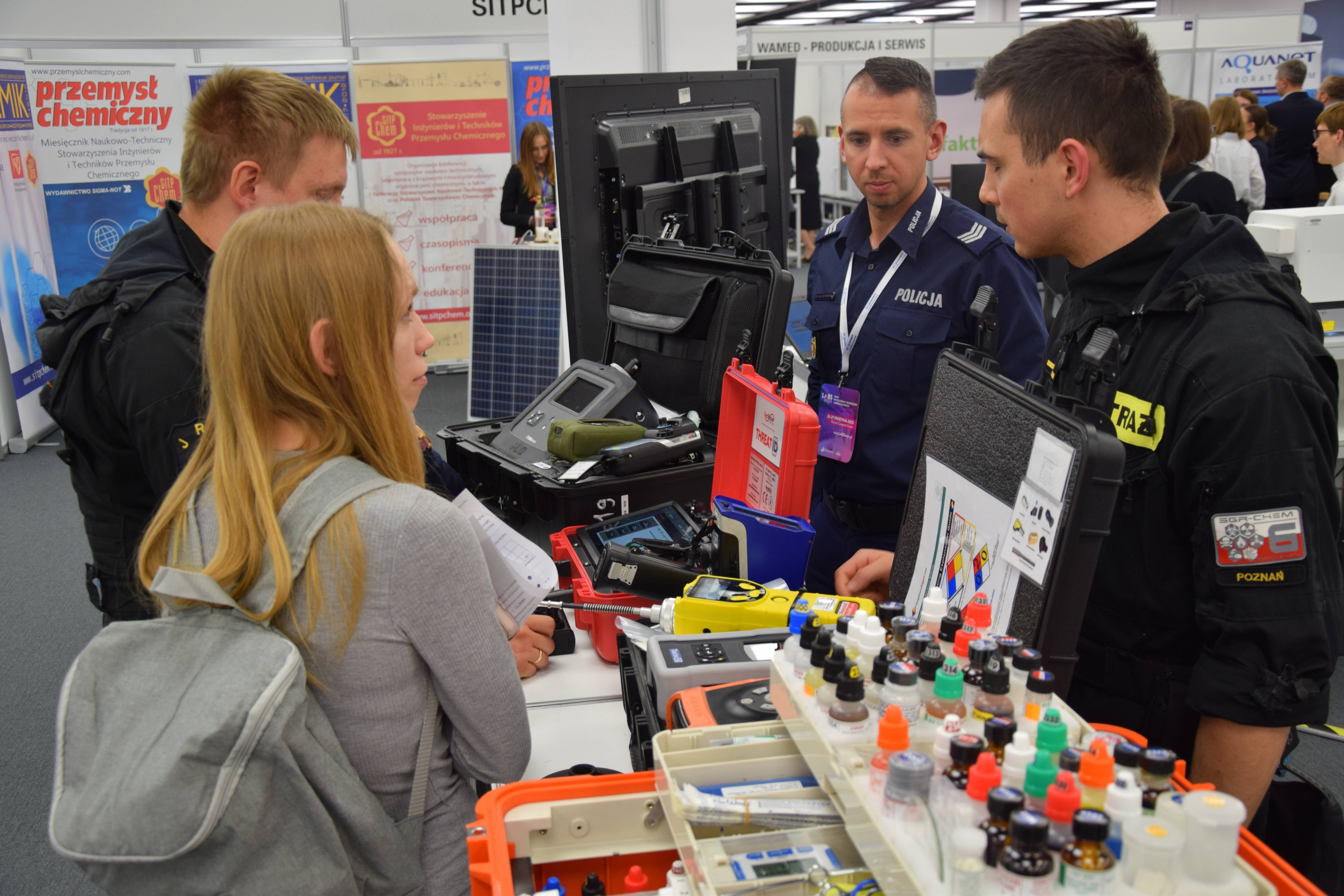 W dniach 26 i 27 kwietnia br. specjaliści z poznańskiej "szóstki" wzięli udział na Międzynarodowych Targach Poznańskich w Targach Wyposażenia i Technologii Laboratoryjnych Labs Expo w Poznaniu. Dzięki wspólnej inicjatywie Komendy Miejskiej Państwowej Straży Pożarnej w Poznaniu oraz Laboratorium Kryminalistycznego Komendy Wojewódzkiej Policji w Poznaniu świat nauki i technologii mógł poznać punkt widzenia strażaków i policjantów dotyczący chemii i dziedzin pochodnych oraz doświadczenia mundurowych w tym kierunku. Dwa dni zostały w całości wypełnione wymianą poglądów oraz wiedzy dotyczącej zagrożeń chemicznych, funkcjonowania systemu reagowania na te zagrożenia oraz szeroko pojętego bezpieczeństwa chemicznego. Nie zabrakło wątków "głęboko technicznych" dotyczących wykorzystywanych przez służby technik analitycznych takich jak: chromatografia gazowa sprzężona ze spektrometrią mas, spektroskopia Ramana, spektroskopia w podczerwieni, spektroskopia w ultrafiolecie i świetle widzialnym czy spektroskopia fluorescencji rentgenowskiej. Z bardzo dużym zainteresowaniem spotkały się prezentowane przez poznańskich chemików metody kolorymetryczne oraz sposoby ich stosowania podczas skomplikowanych operacji analitycznych. Poza sprzętem analitycznym, samochody będące na wyposażeniu SGRChem - Eko "Poznań 6", stanowiły główny punkt zainteresowania wystawców oraz zaproszonych gości. Podczas wydarzenia, wizytą zaszczycił Zastępca Komendanta Wojewódzkiego Policji insp. Sławomira Piekuta oraz Komendant Miejski Państwowej Straży Pożarnej st. bryg. Jacek Michalak wraz z Zastępcą bryg. Radosławem Hurnikiem, co było okazją do przedyskutowania problematyki współdziałania z Policją podczas wystąpienia zagrożeń CBRNE oraz określenia ram współpracy szkoleniowej w przedmiotowym zakresie.