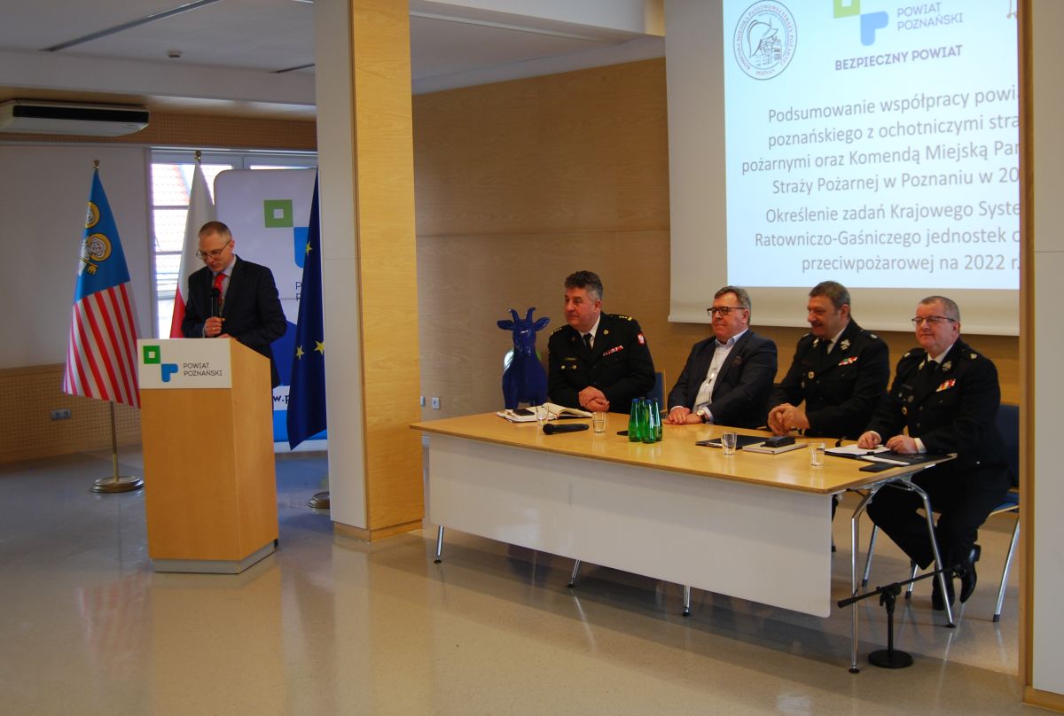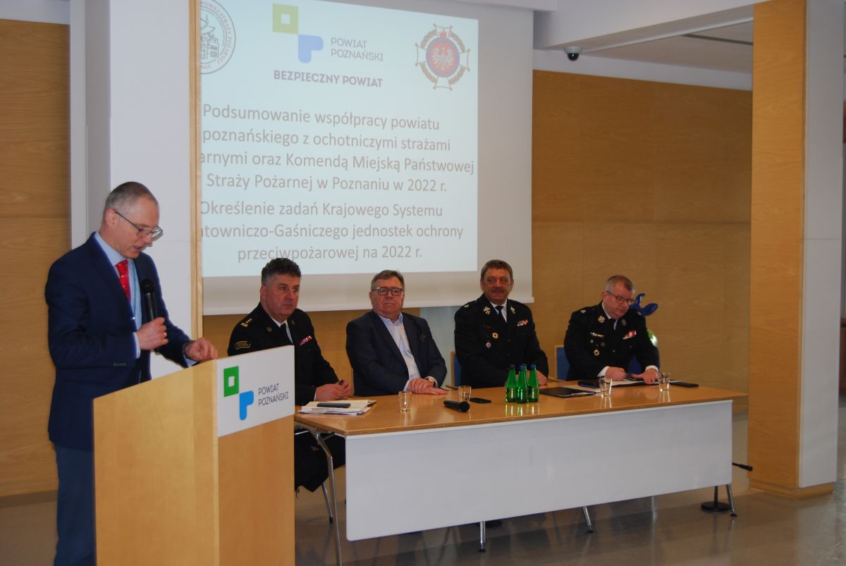 W siedzibie Starostwa Powiatowego w Poznaniu, 18 lutego odbyło się spotkanie poświęcone podsumowaniu współpracy powiatu poznańskiego z Ochotniczymi Strażami Pożarnymi oraz Komendą Miejską Państwowej Straży Pożarnej w Poznaniu w 2022 roku. W tym okresie na ich wsparcie powiat poznański przeznaczył środki finansowe w wysokości odpowiednio 342 017,50 oraz 1 090 000 złotych.