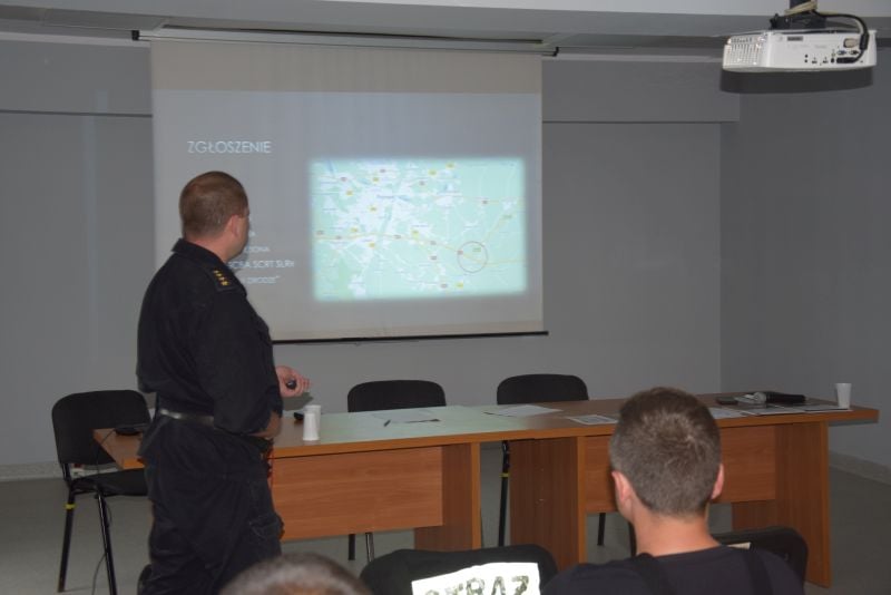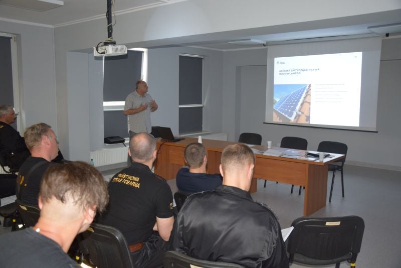 Szczegółowo omówiono zagrożenia ze strony ogniw fotowoltaicznych w działaniach ratowniczych, które zaprezentował przedstawiciel firmy zewnętrznej, a także funkcjonariusz Szkoły Aspirantów PSP w Poznaniu mł. kpt. Waldemar Pruss.
