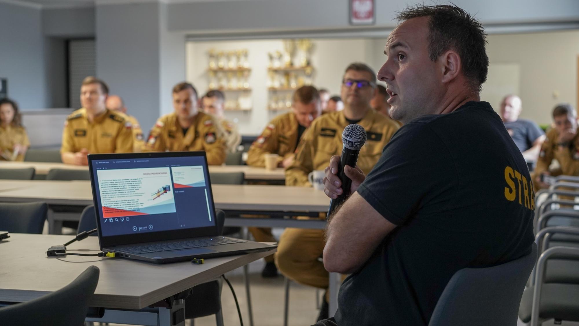 Kolejnym prelegentem był kpt. Bartosz Gościński z Wydziału Kontrolno-Rozpoznawczego, który poruszył kwestie kontroli obiektów wielkopowierzchniowych oraz składowisk odpadów. Tematyka ta jest niezwykle istotna w kontekście zapobiegania pożarom i minimalizowania ryzyka związanego z tego typu miejscami.