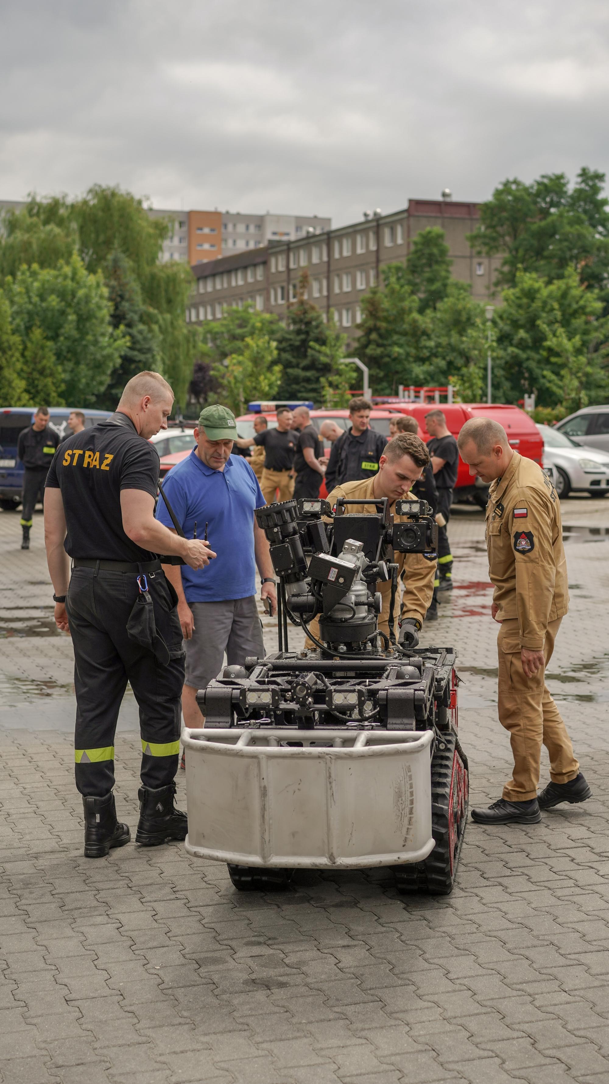 W dalszej części szkolenia funkcjonariusze JRG nr 6 przedstawili temat detekcji skażeń promieniotwórczych oraz zaprezentowali możliwości robota gaśniczego COLOSSUS. Pokaz ten ukazał nowoczesne podejście do działań ratowniczych, które zwiększa bezpieczeństwo strażaków i efektywność prowadzonych akcji.