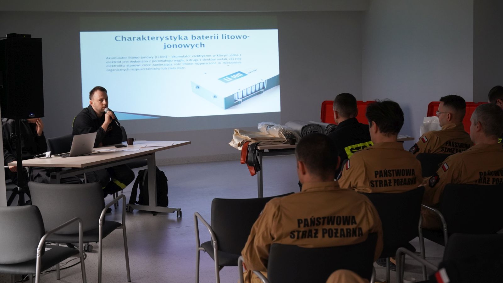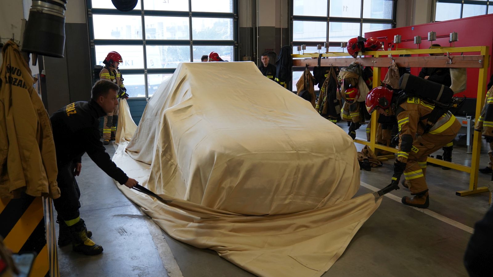 Następnie st. kpt. Bartosz Suski omówił zagadnienia związane z zagrożeniami, wynikającymi z pożarów pojazdów elektrycznych oraz zastosowanie płachty gaśniczej podczas pożarów samochodów.