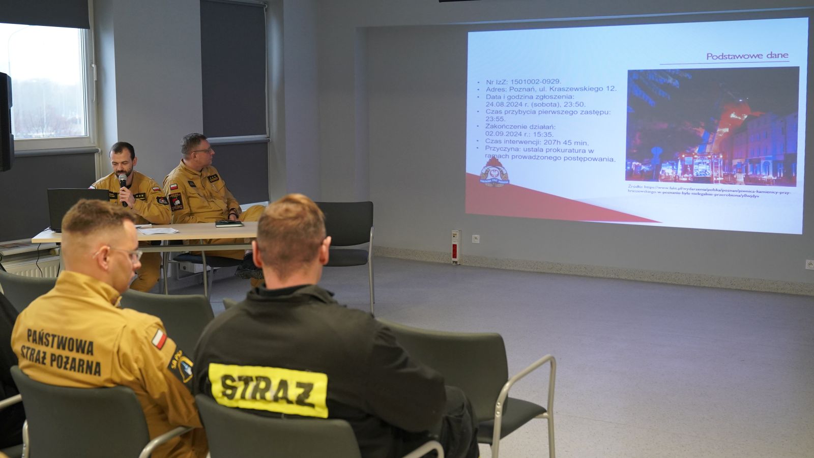 Szkolenie rozpoczęło się od wystąpienia kpt. Roberta Surowca z Wydziału Operacyjno-Szkoleniowego KM PSP w Poznaniu, który omówił działania prowadzone przy tragicznym pożarze kamienicy przy ul. Kraszewskiego w Poznaniu.