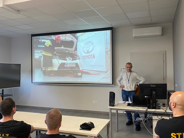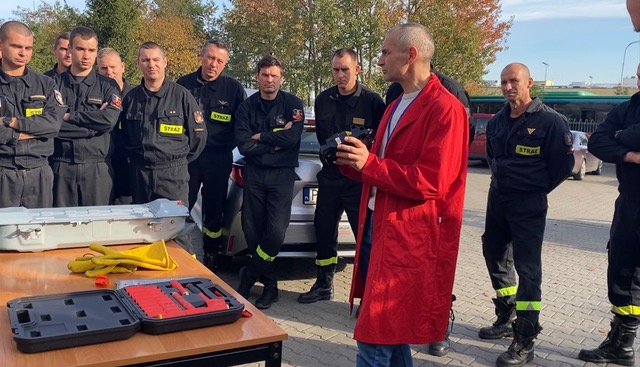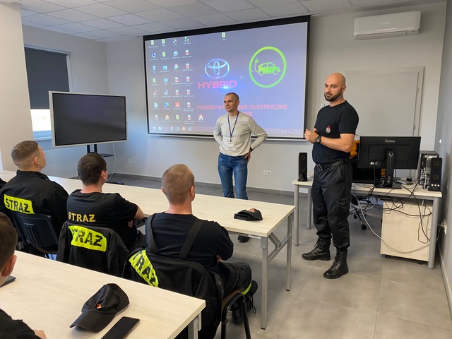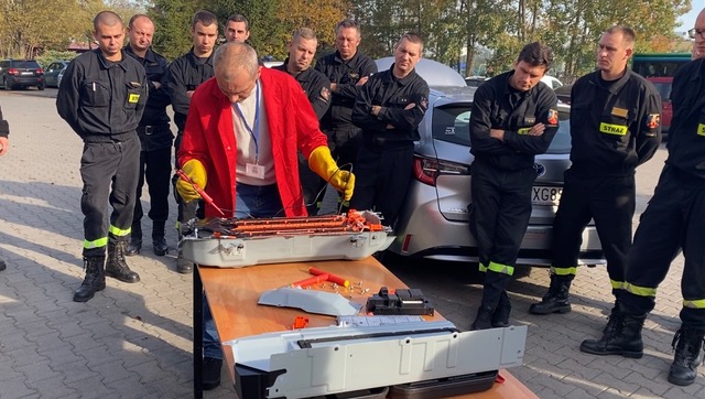 Podczas szkolenia przeprowadzonego przez Pana Krzysztofa Pedę, strażacy poznali ponadto budowę modułów bateryjnych oraz niebezpieczeństwo związane z ich eksploatacją.