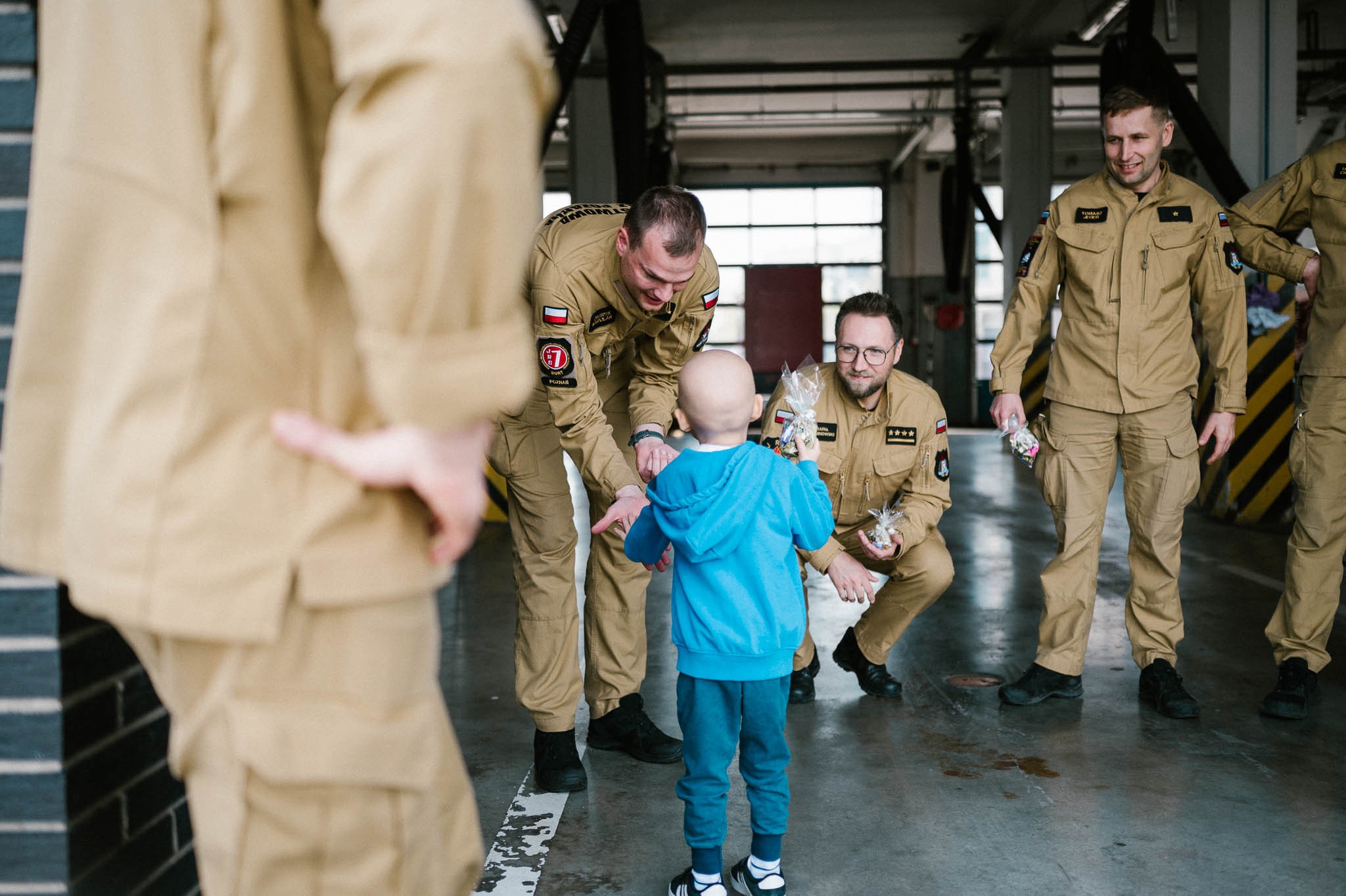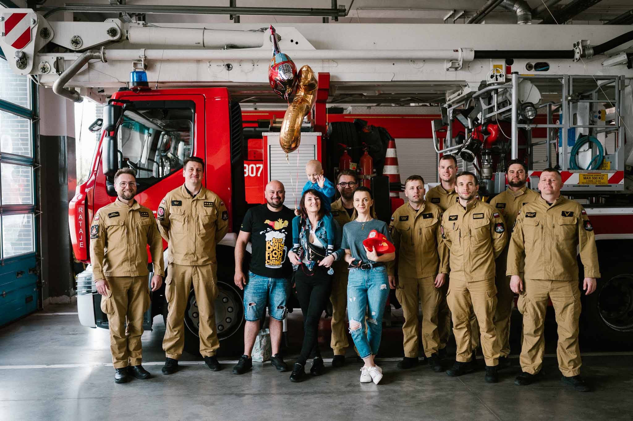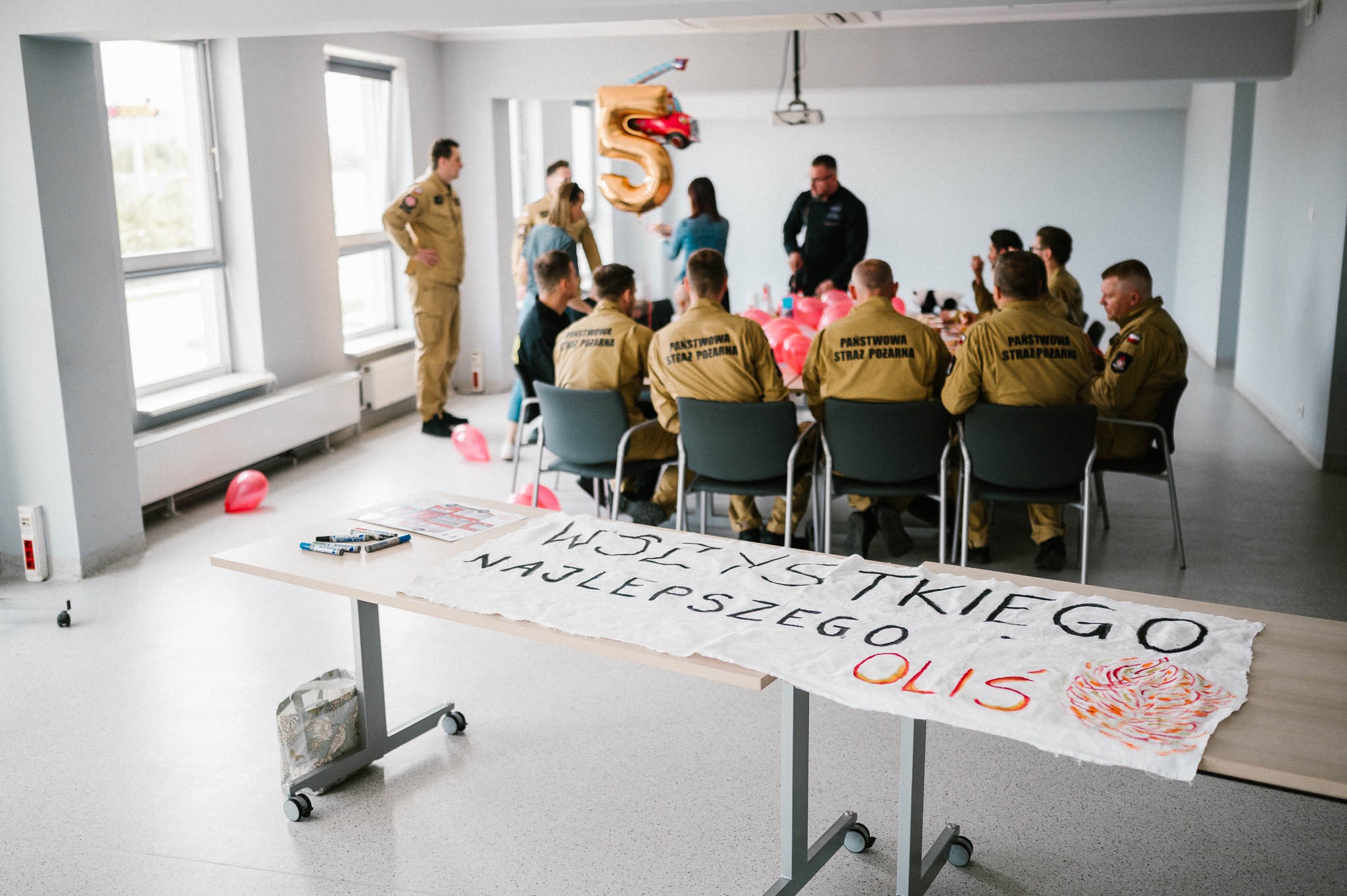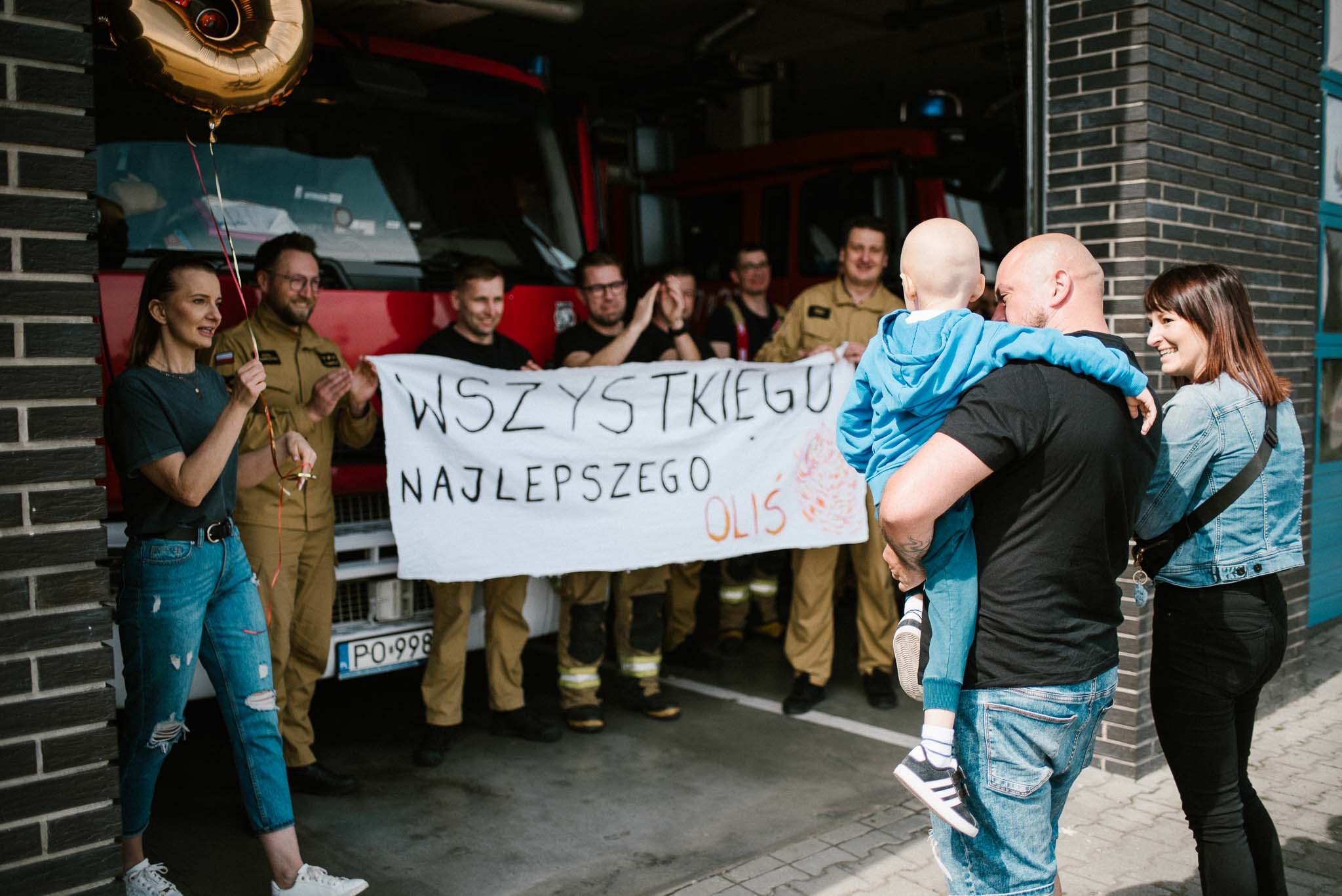 na głośnikach pojawiła się zapowiedź do wyjazdu: „Uwaga! Uwaga! Zastęp GBA uda się alarmowo na plac wewnętrzny Jednostki Ratowniczo-Gaśniczej nr 7 i ugasi…pachołki”, dzielny Oliś w asyście kolegów strażaków ze zmiany udał się na miejsce. Tam jak na strażaka przystało, ugasił pożar. Po powrocie na koszary, na naszego małego solenizanta czekał tort, szampan borówkowy i prezenty!