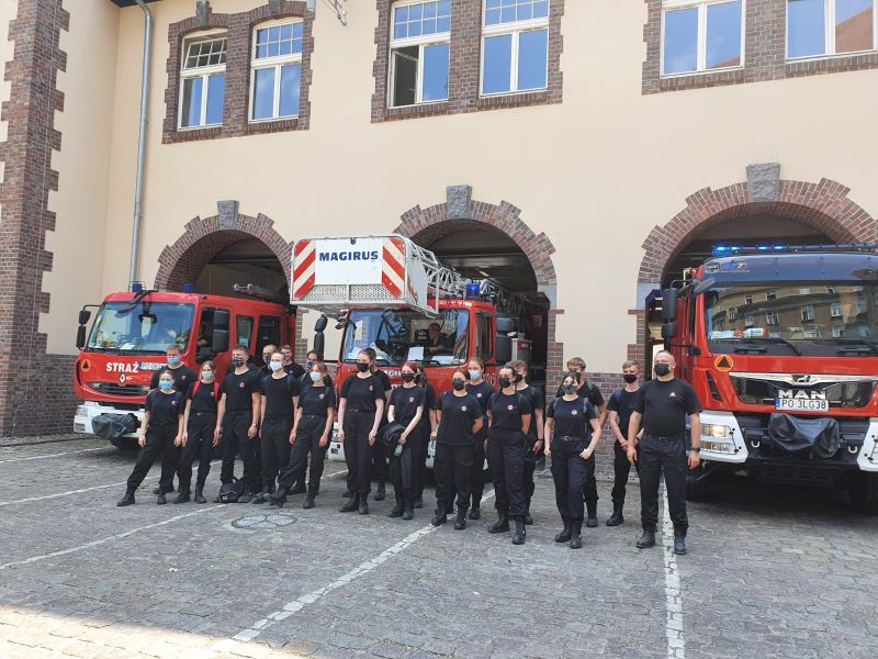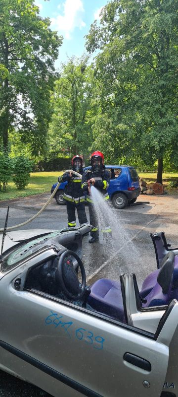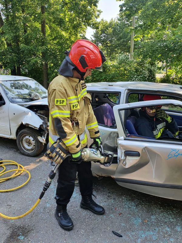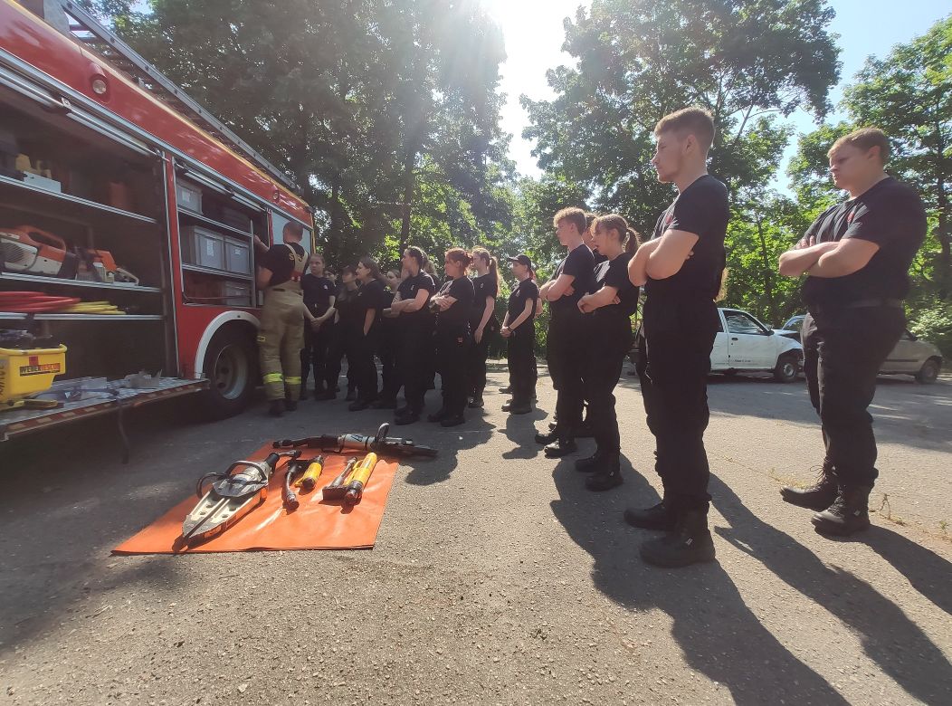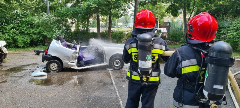 Na terenie JRG nr 2 odbyły się warsztaty pożarnicze dla klas mundurowych Zespołu Szkół Handlowych w Poznaniu. Szkoła ta już od dłuższego czasu współpracuje z naszą jednostką w zakresie kształcenia swoich uczniów. Zmiana III przygotowała dla uczniów wiele atrakcji. Na samym początku uczniowie wysłuchali krótkiego wykładu dotyczącego podstawowych wiadomości z zakresu ratownictwa technicznego oraz występujących zagrożeń w trakcie zdarzeń drogowych. Jako ciekawostkę przedstawiono zasadę działania poduszek powietrznych w samochodach, a następnie na specjalnie przygotowanym stanowisku, nastąpił pokaz wystrzału poduszki, co miało zobrazować prędkość oraz siłę wystrzału poduszki. Na kolejnym stanowisku ratownicy, używając narzędzi hydraulicznych, pokazali techniki uwalniania osób poszkodowanych z pojazdów. Ratownicy wskazali na różnice pomiędzy szybą przednią (klejoną) a pozostałymi, pokazali techniki stabilizacji pojazdu, usunięcia drzwi oraz dachu pojazdu. Każdy z uczniów mógł przećwiczyć ewakuację osoby poszkodowanej z pojazdu. Na tym zakończyła się cześć dotycząca ratownictwa technicznego. Kolejnym etapem warsztatów była część gaśnicza. Uczniowie rozwijali linię główną oraz gaśniczą, a następnie uczyli się zasad podawania prądów gaśniczych. Ostatnim etapem warsztatów, w związku z bardzo wysoką temperaturą, było sprawienie linii gaśniczej, do której uczniowie podłączyli kurtynę wodną. Tak przygotowane stanowisko pozwoliło każdemu się schłodzić i odpocząć po wyczerpujących warsztatach. Na koniec wszyscy udali się przed bramy wyjazdowe naszej pięknej zabytkowej jednostki, gdzie nastąpiło wykonanie wspólnego pamiątkowego zdjęcia. Mamy nadzieję, że warsztaty się podobały, a zdobyte doświadczenie pomoże w dalszych działaniach zmierzających do wkroczenia w szeregi Państwowej Straży Pożarnej.