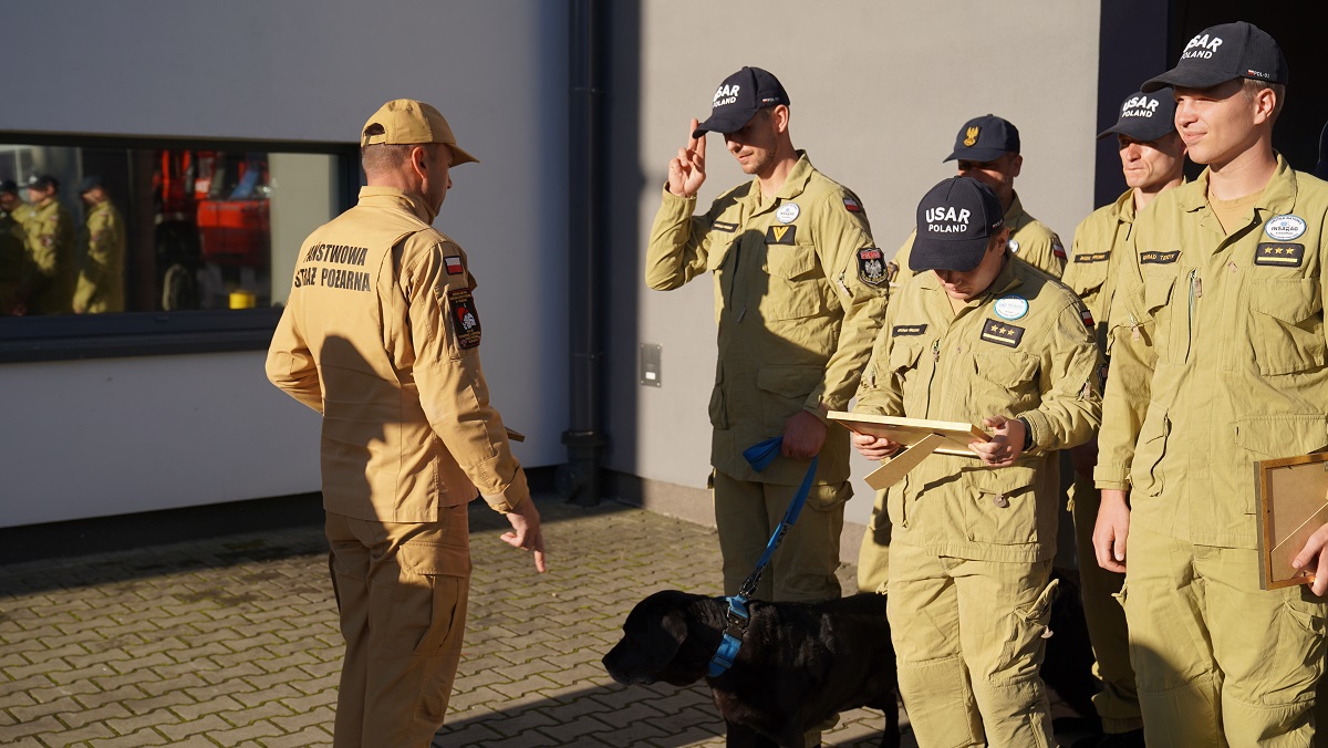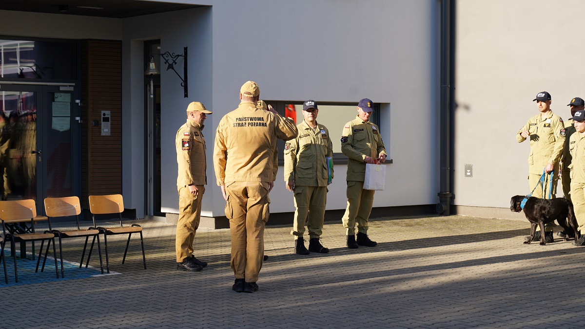 a Zastępca Wielkopolskiego Komendanta Wojewódzkiego wręczył okolicznościowe dyplomy Komendanta Głównego Państwowej Straży Pożarnej nadbryg. Wojciecha Kruczka. Następnie wszyscy, łącznie z psami ratowniczymi, ustawili się do pamiątkowego zdjęcia.