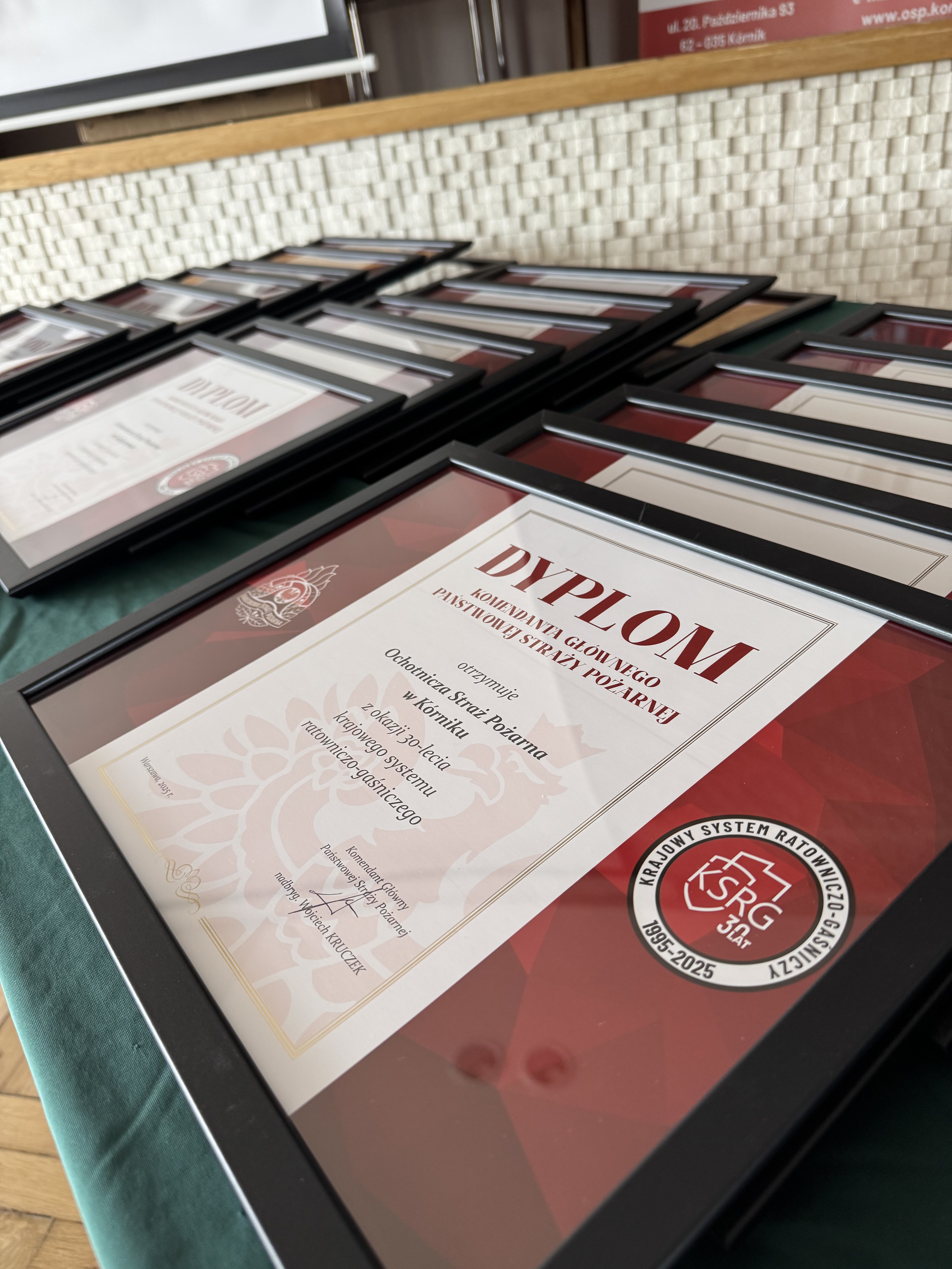 Komendant Miejski Państwowej Straży Pożarnej w Poznaniu st. bryg. Jacek Michalak, w obecności Prezesa Oddziału Powiatowego Związku Ochotniczych Straży Pożarnych Rzeczypospolitej Polskiej druha Wacława Zajączkowskiego oraz Komendanta Gminnego OSP w Kórniku druha Andrzeja Szyca, wręczył dyplomy Komendanta Głównego PSP, przyznane z okazji rocznicy 30-lecia Krajowego Systemu Ratowniczo-Gaśniczego.