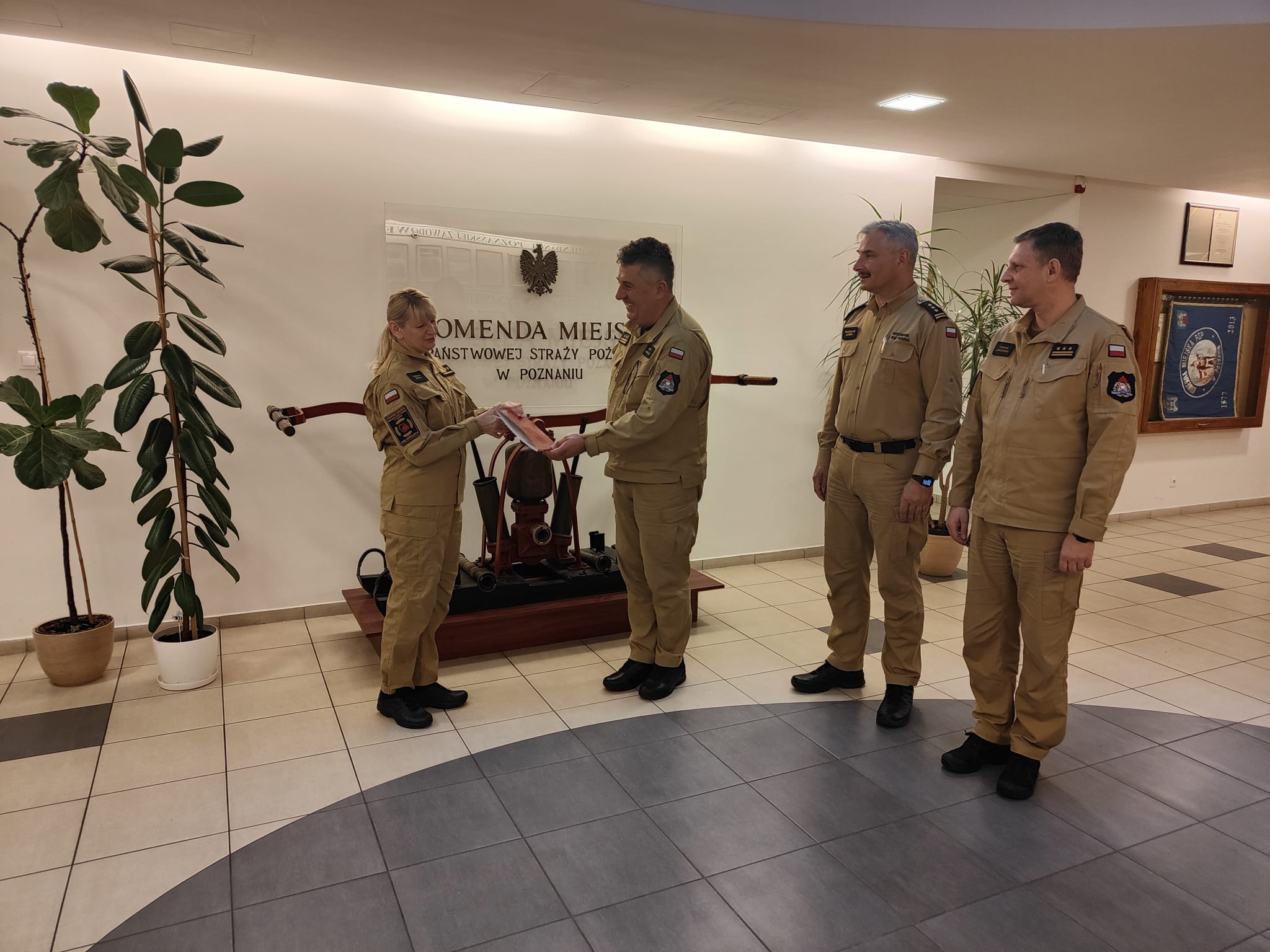 W dniu 24 października 2023r. Komendant Miejski Państwowej Straży Pożarnej w Poznaniu st. bryg. Jacek Michalak w obecności Zastępców: st.bryg. Radosława Hurnika oraz st.bryg. Damiana Jankowiaka wręczył nagrodę jubileuszową za 35 lat pracy i służby – st.kpt. Donacie Botta.