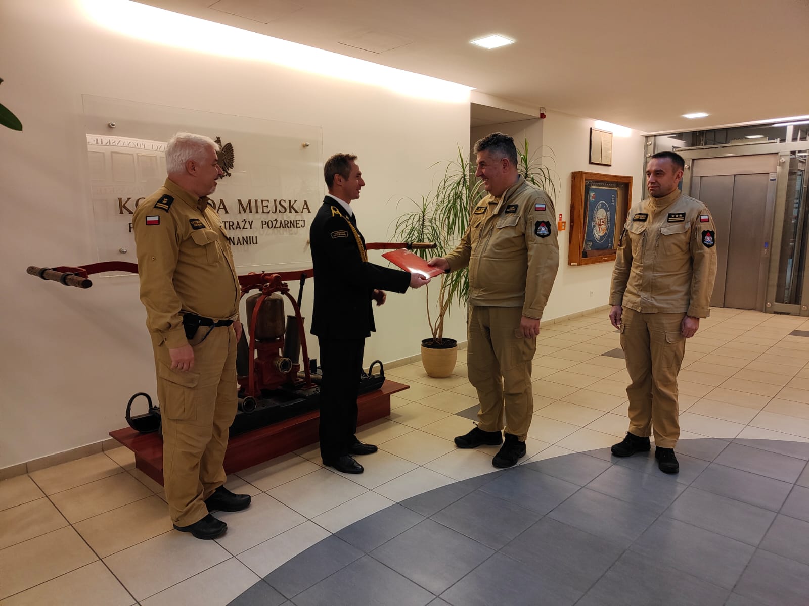 Dnia 28 listopada 2024 r. Komendant Miejski Państwowej Straży Pożarnej w Poznaniu st. bryg. Jacek Michalak w obecności Zastępcy Komendanta st. bryg. Grzegorza Banaszaka oraz Dowódcy Jednostki Ratowniczo-Gaśniczej nr 5 bryg. Krzysztofa Bugajaka wręczył nagrodę jubileuszową st. ogn. Pawłowi Mańczakowi, starszemu operatorowi sprzętu z JRG nr 5