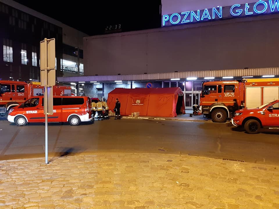 Strażacy zapewnili równiez na poznańskim dworcu kolejowym ogrzewane namioty wraz z wyposażeniem.