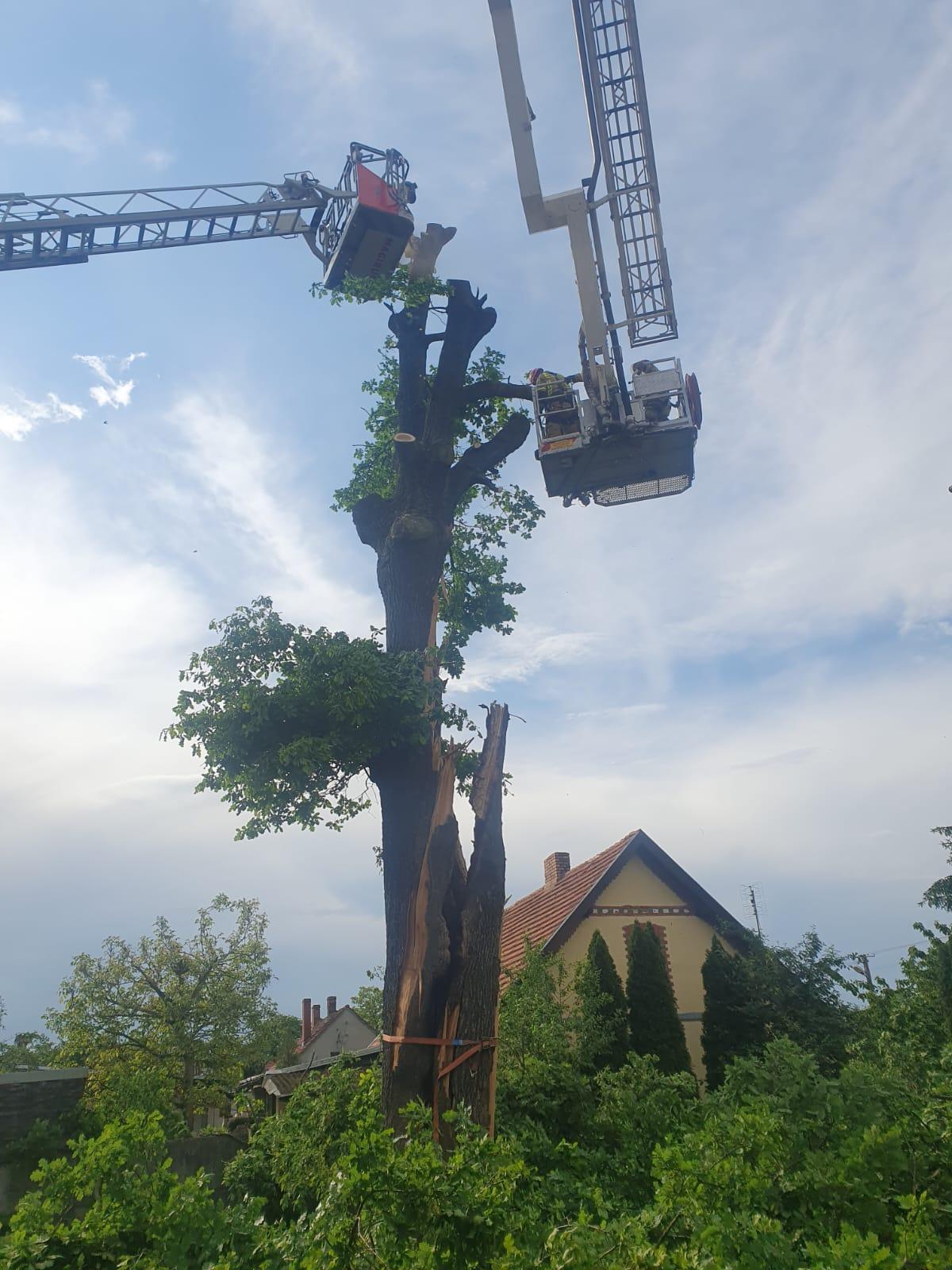 Wystąpiła potrzeba zsynchronizowanych działań ratowników operujących pilarkami do drewna z drabiny i podnośnika tak aby nie dopuścić do dalszej destabilizacji pnia, która to zagrażała całkowitym obaleniem się drzewa oraz uszkodzenia zabudowań.
