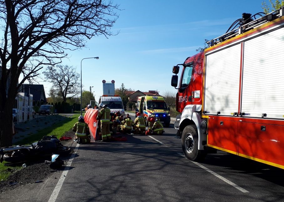 Po dojeździe na miejsce zdarzenia Jednostek Ochrony Przeciwpożarowej zastano rozbity motocykl oraz samochód osobowy. W wyniku zderzenia jedna osoba odniosła obrażenia. Po zaopatrzeniu, poszkodowany został odwieziony do szpitala przez Zespół Ratownictwa Medycznego.