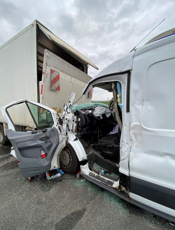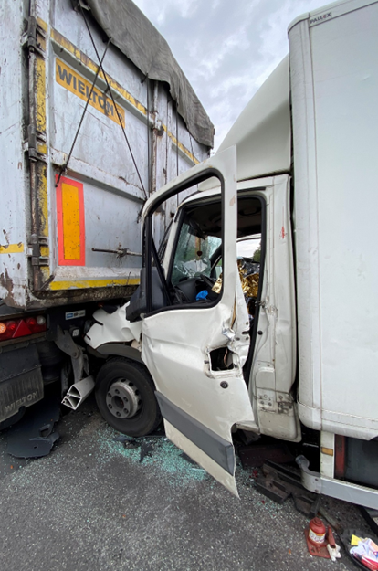 Po przybyciu na miejsce zdarzenia zastano zderzenie trzech pojazdów - dwóch samochodów dostawczych oraz jednego samochodu ciężarowego z naczepą. Kierowca samochodu ciężarowego opuścił pojazd o własnych siłach, natomiast kierujący samochodami dostawczymi byli uwięzieni w pojazdach.