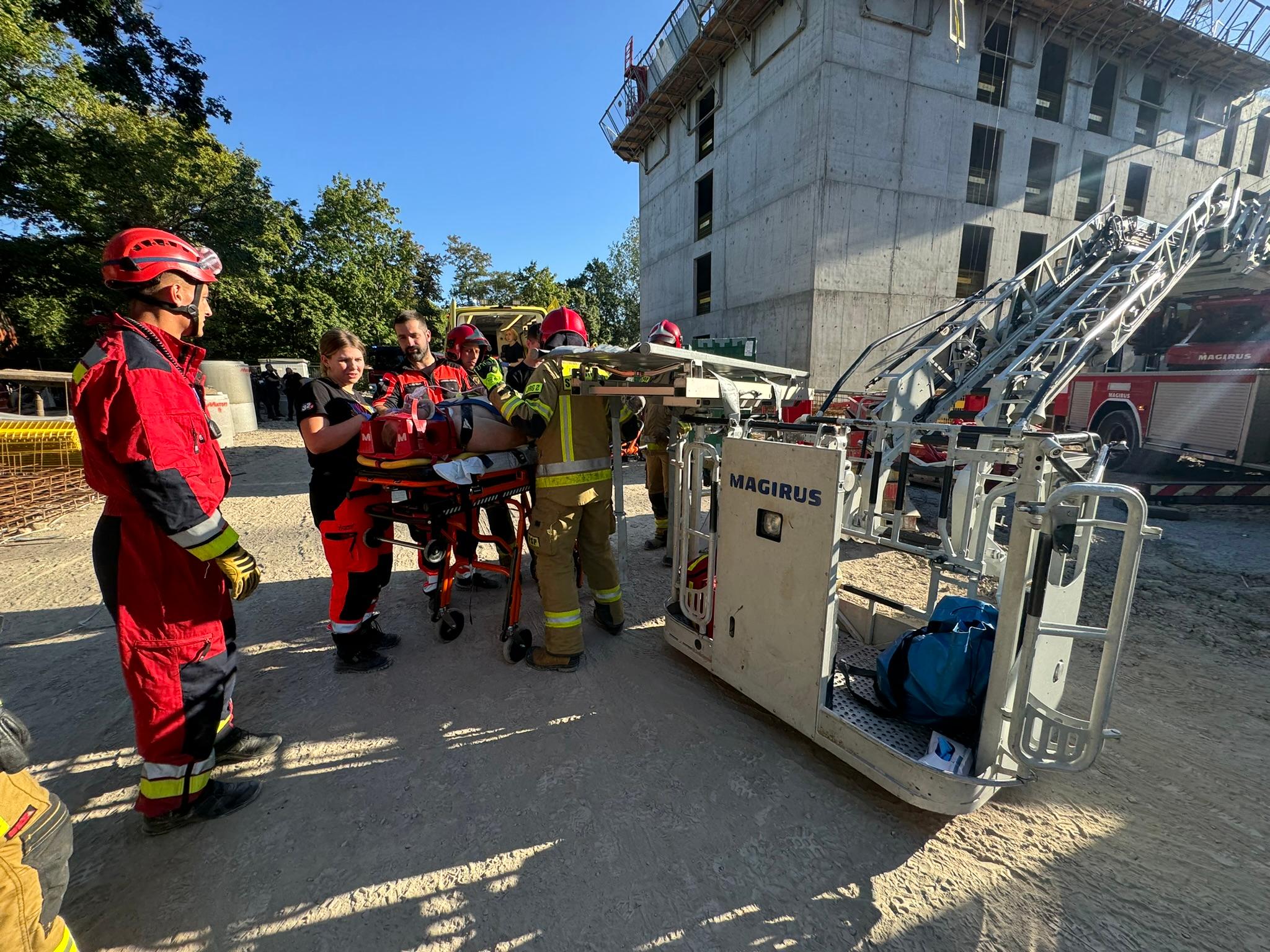 Dnia 13 sierpnia 2024 r ok. godz. 17:00 zastępy GCBA-Rt, SCD-32 oraz SLRr z JRG nr 2 zostały zadysponowane na ul. Grunwaldzką, gdzie doszło do wypadku na terenie budowy. Ze wstępnych informacji wynikało, że jeden z pracowników został uderzony przez żuraw i wymagana jest ewakuacja z wysokości. Po dojeździe na miejsce zdarzenia i przeprowadzeniu rozpoznania Kierujący Działaniem Ratowniczym podjął decyzję o ewakuacji poszkodowanego z użyciem SCD-32. Poszkodowany był przytomny jednak liczne złamania wymusiły jego ewakuację w pozycji poziomej przy użyciu deski ortopedycznej i noszy mocowanych do kosza drabiny. Na miejsce dotarła również Specjalistyczna Grupa Ratownictwa Wysokościowego z JRG nr 5. Dzięki sprawnym działaniom strażaków udało się szybko i bezpiecznie ewakuować poszkodowanego, który następnie został zabrany do szpitala przez Zespół Ratownictwa Medycznego.