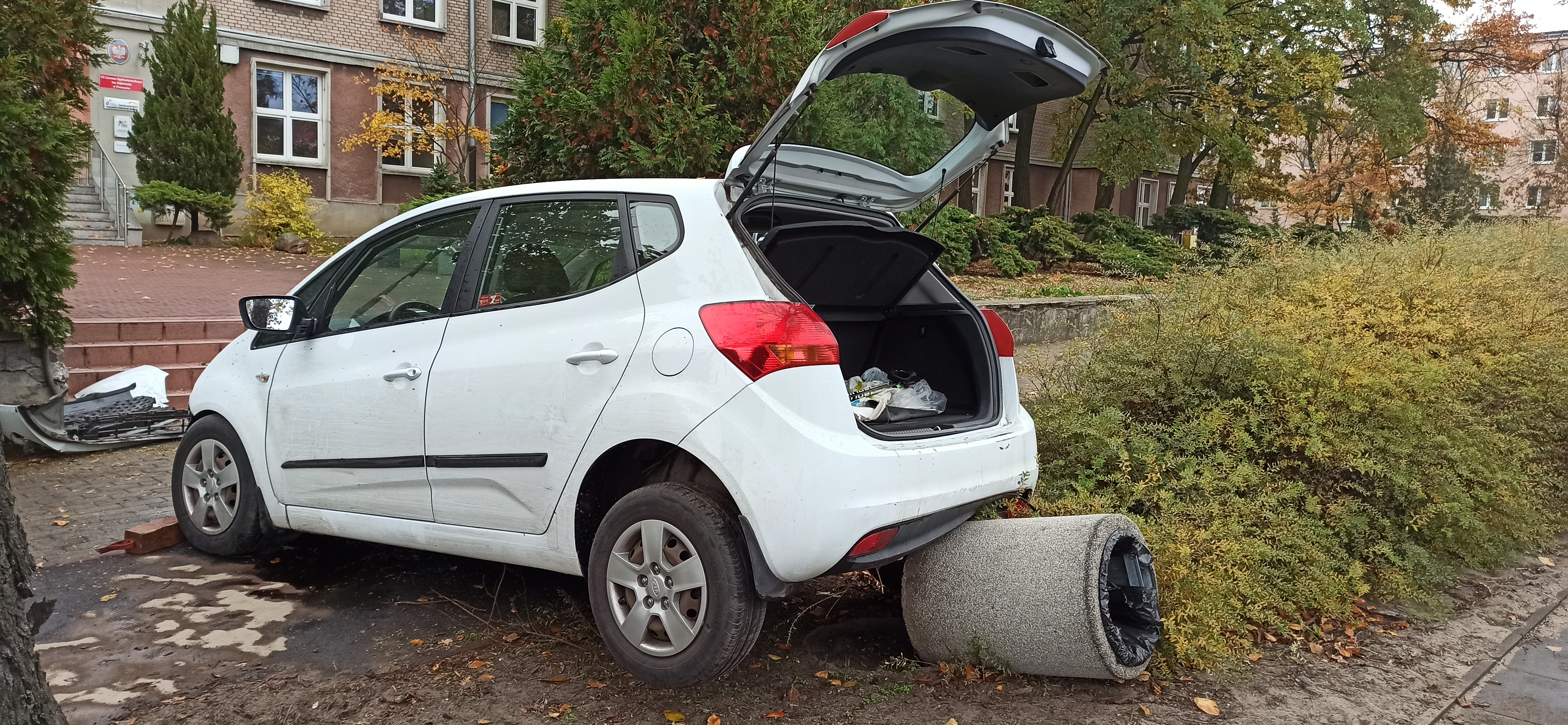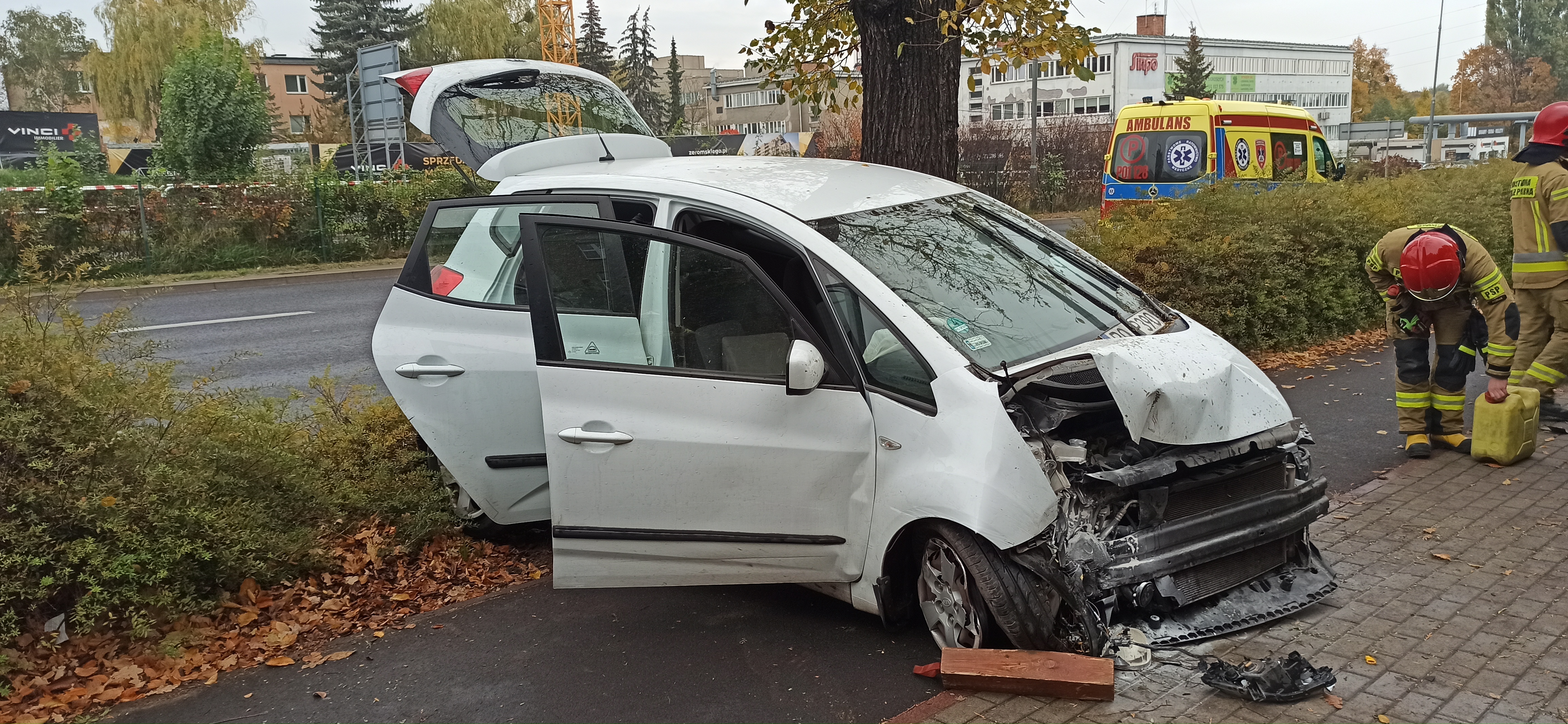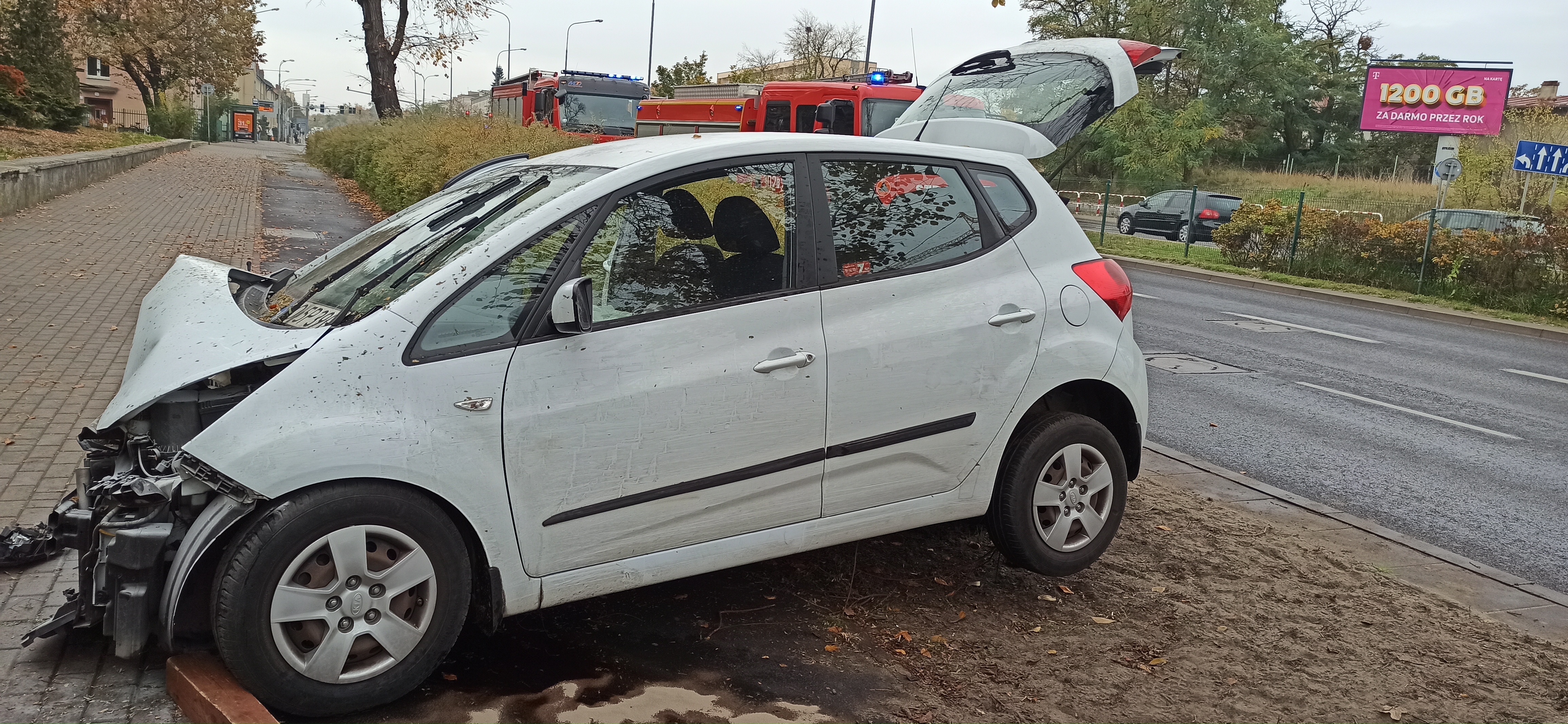 Po przybyciu na miejsce zdarzenia zastano świadków, którzy poinformowali strażaków, że kierujący samochodem osobowym KIA VENGA w trakcie jazdy ulicą Stanisława Żeromskiego zjechał na chodnik po czym uderzył w barierki wygrodzeniowe i betonowy kosz. W chwili przyjazdu straży pożarnej osoby poszkodowane znajdowały się poza pojazdem.