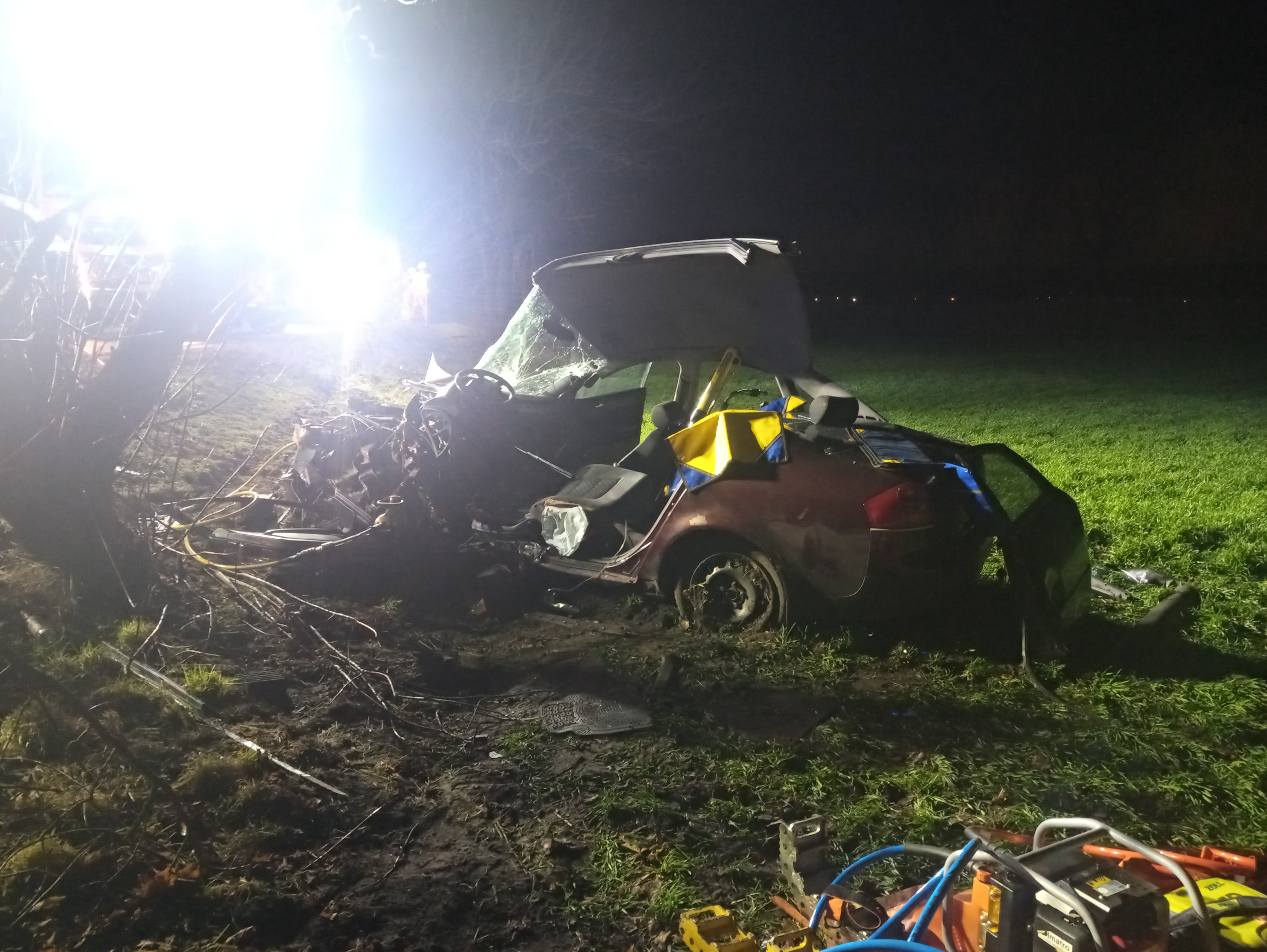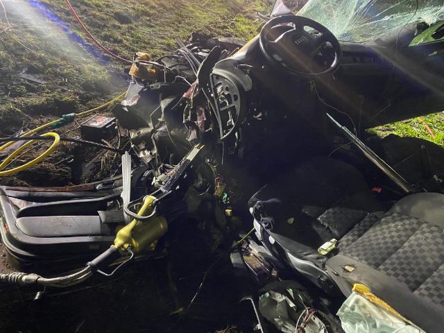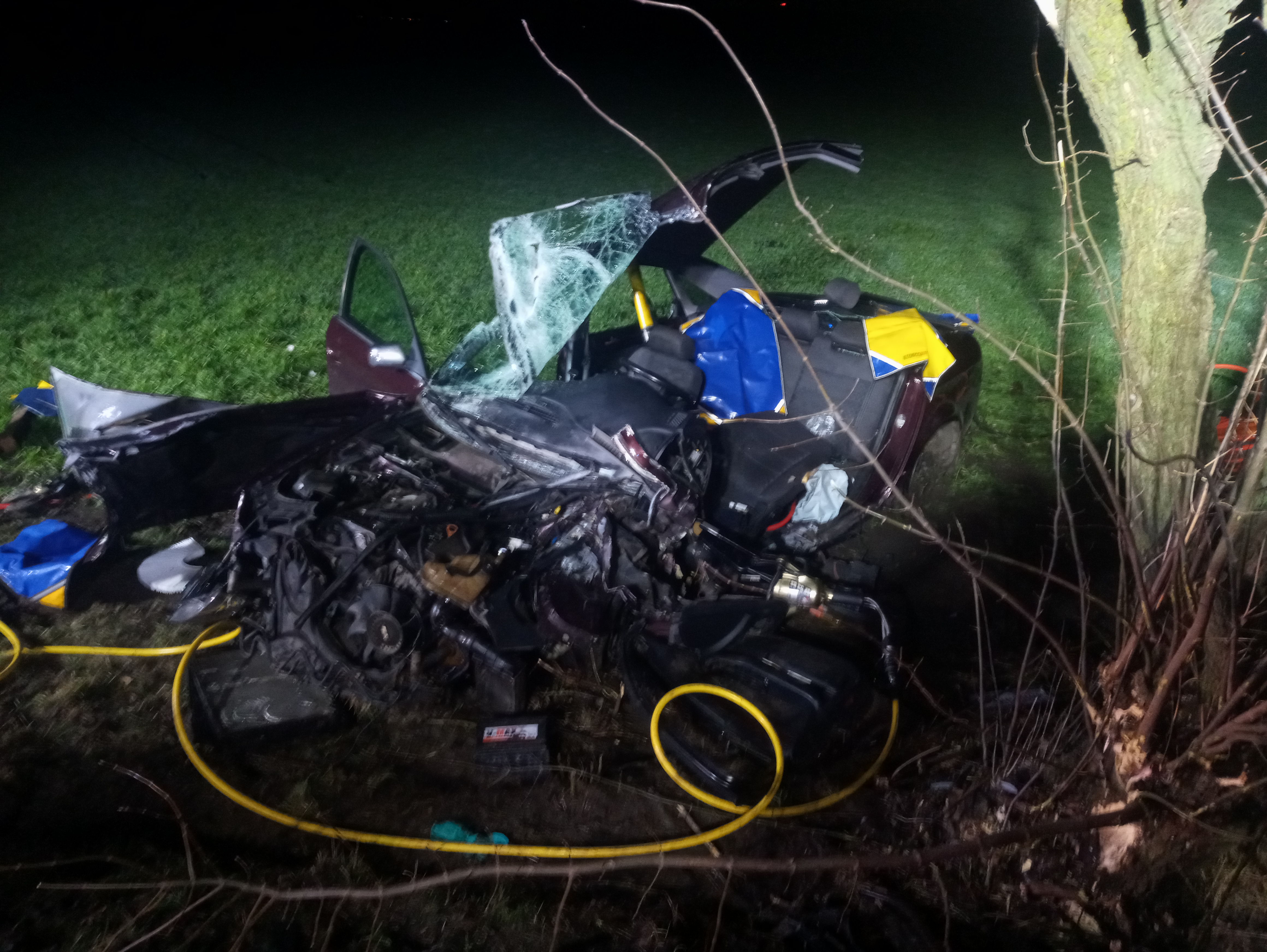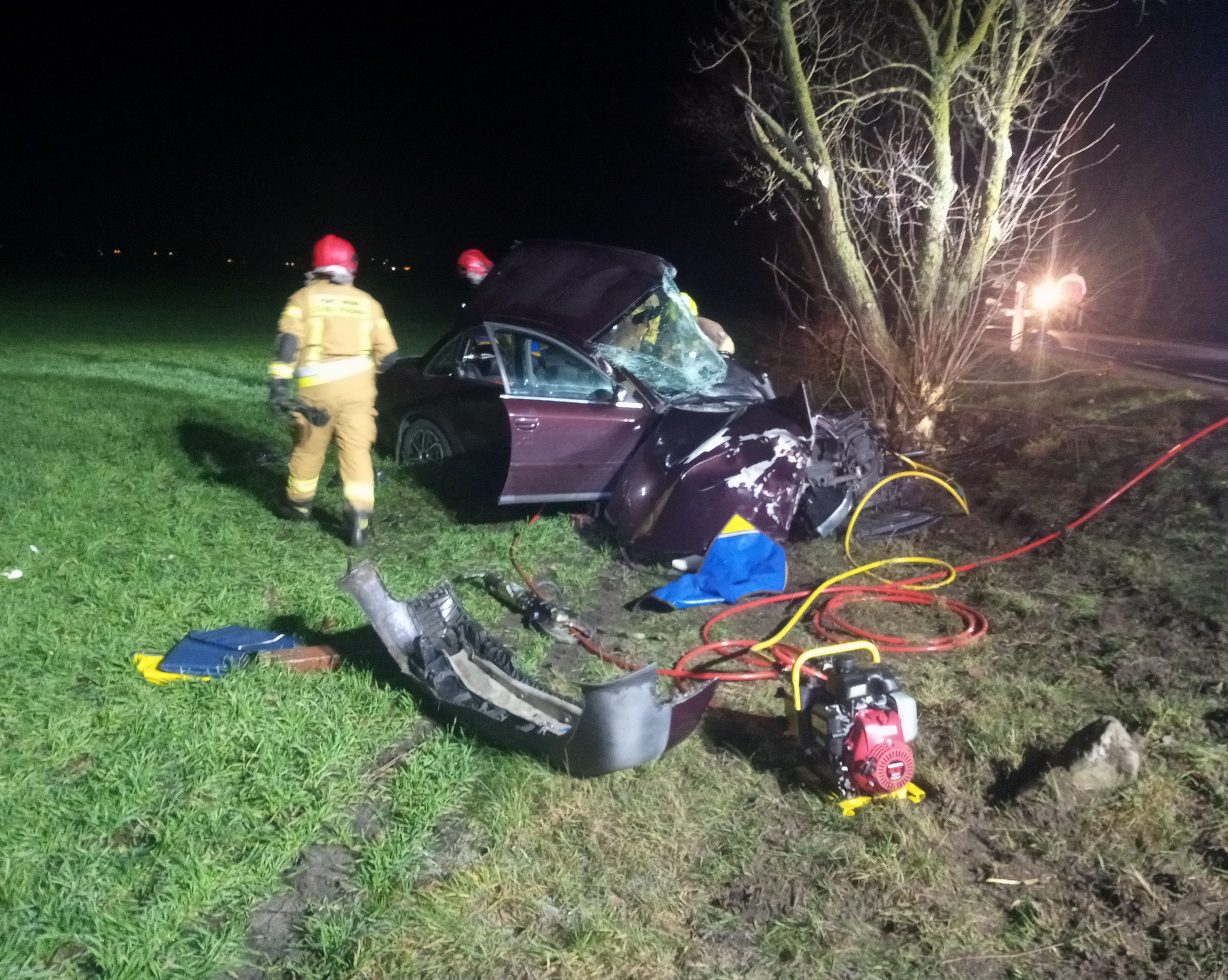 Po przybyciu na miejsce zdarzenia Jednostek Ochrony Przeciwpożarowej zastano samochód osobowy, który wypadł z drogi i uderzył w przydrożne drzewo. W wyniku zdarzenia poszkodowany kierowca nie mógł opuścić pojazdu.