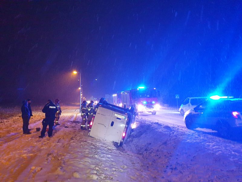Po przybyciu na miejsce zdarzenia, strażacy zastali samochód dostawczy, który wypadł z drogi i dachował w przydrożnym rowie. Kierujący pojazdem opuścił pojazd przed przybyciem służb.