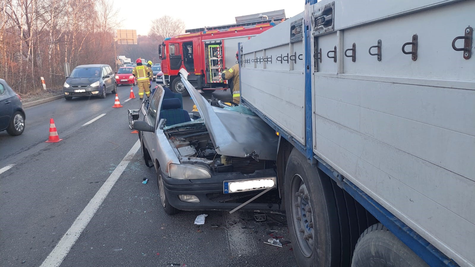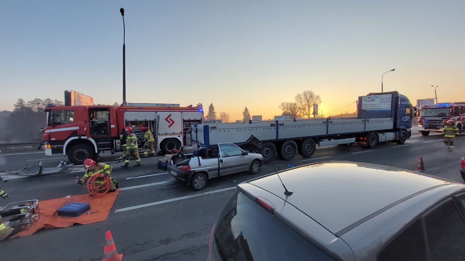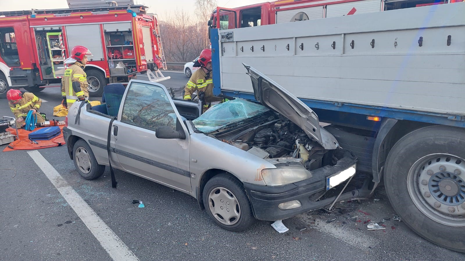 Po przyjeździe na miejsce zdarzenia zastano wypadek z udziałem dwóch samochodów. Samochód marki Peugeot wbił się w tył naczepy ciężarówki. W pojeździe osobowym znajdowały się dwie osoby wymagające pomocy medycznej. Pierwszego mężczyznę ewakuowano drzwiami, natomiast do kierowcy stworzono dostęp przy pomocy narzędzi hydraulicznych (odcięto dach oraz oparcia fotela w celu ewakuacji). Poszkodowanym udzielono niezbędnej pomocy medycznej, a po przyjeździe Zespołu Ratownictwa Medycznego przekazano pod opiekę ratowników. Jeden pas dla potrzeb działań został zablokowany.