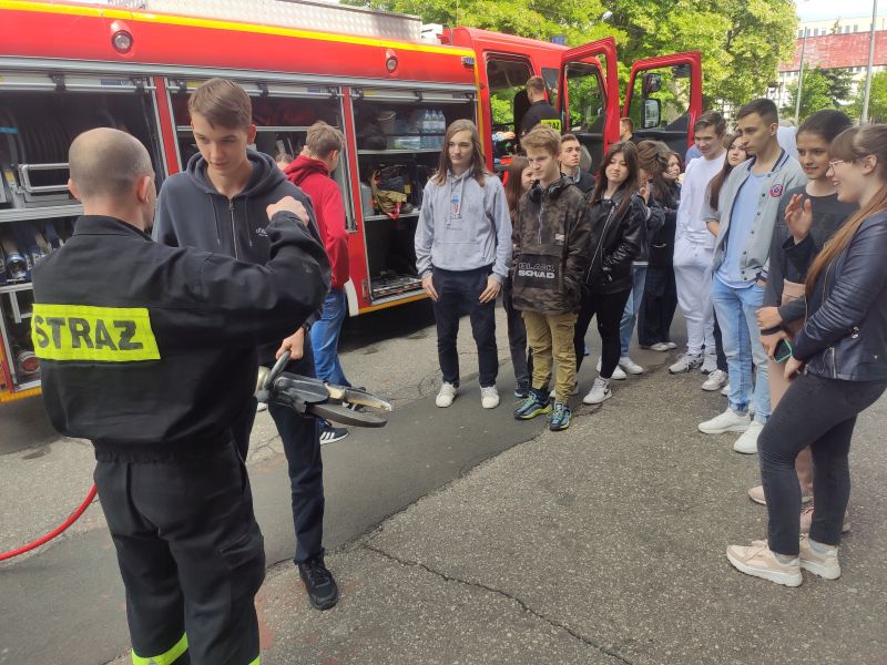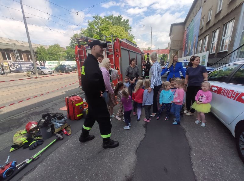 Wizyta strażaków związana była z organizowanym właśnie w tej szkole Dniem Dziecka. Uczelnię odwiedziły dzieci małe (z przedszkola) i duże (ze szkół średnich). Strażacy wszystkim chętnych pokazali sprzęt ratowniczo-gaśniczy oraz opowiedzieli o specyfice pracy strażaka.