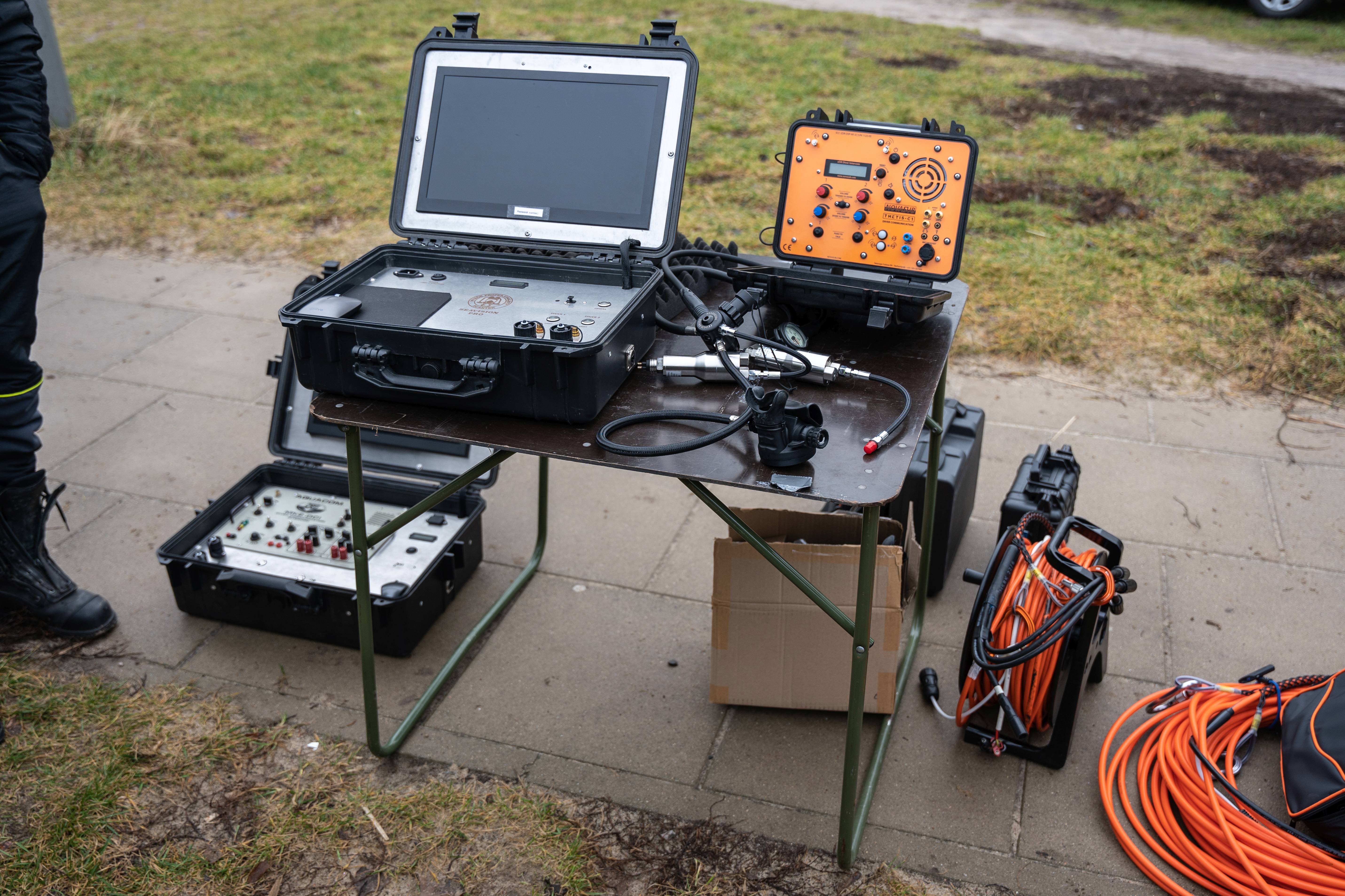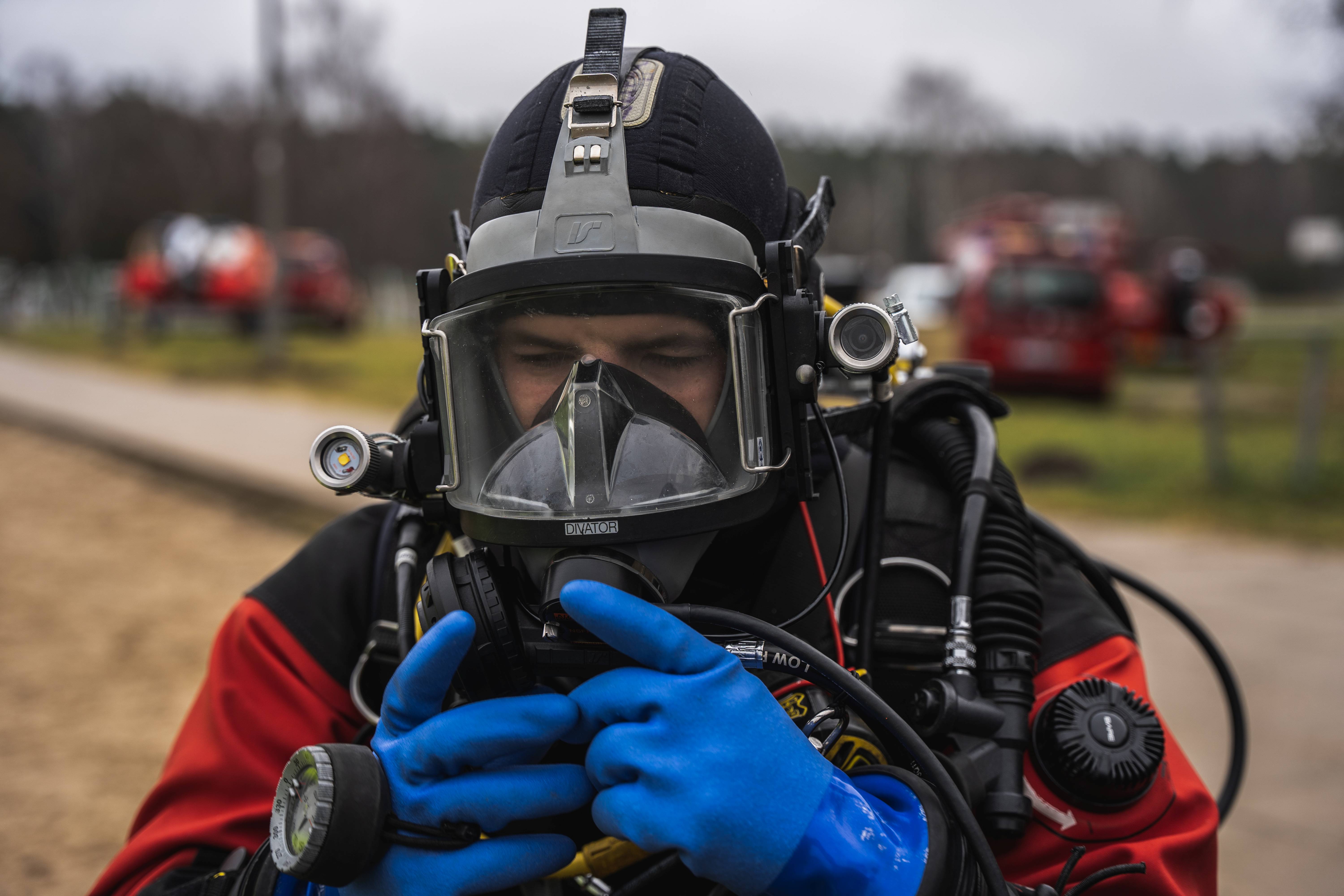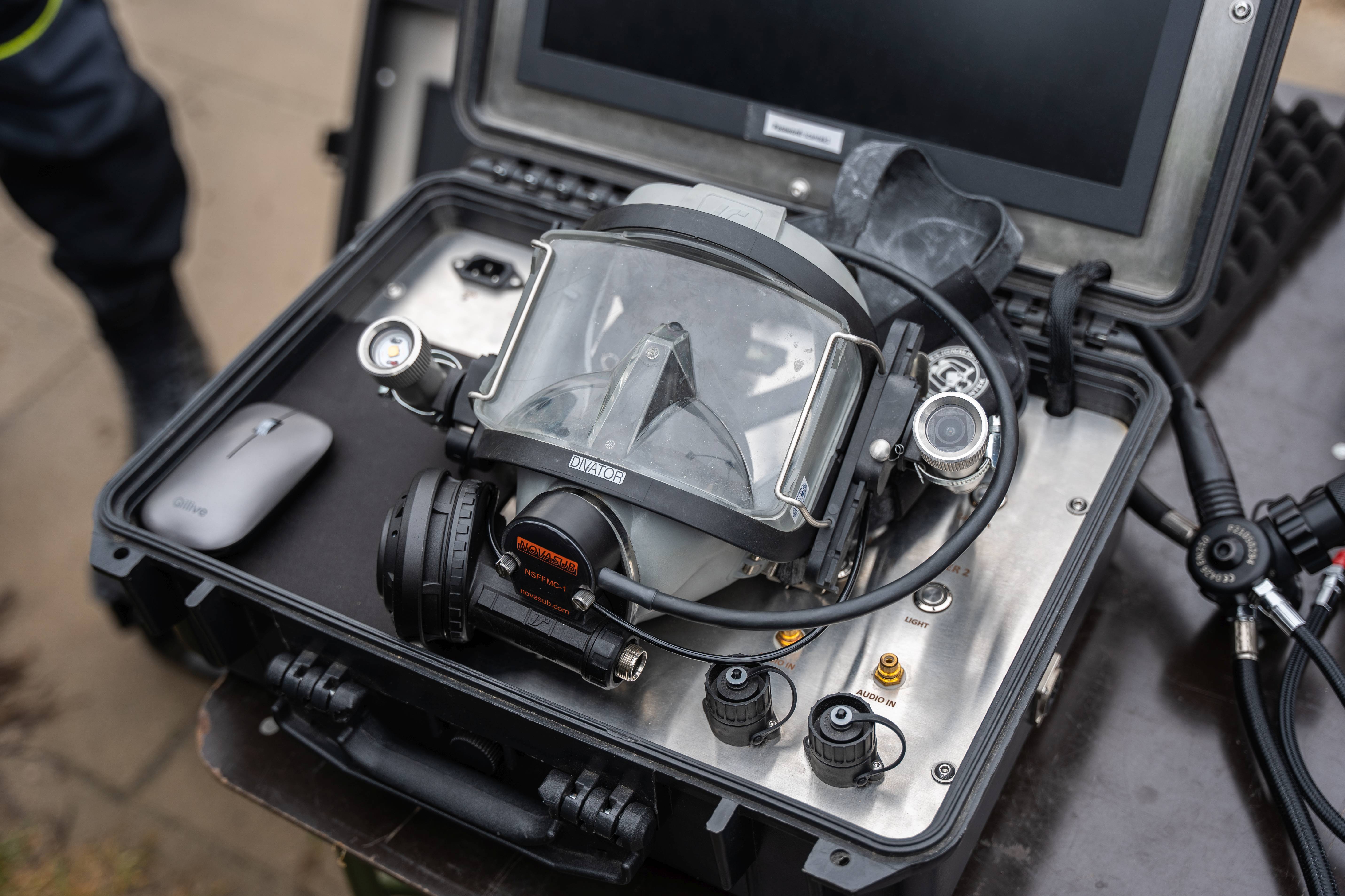 Podczas części teoretycznej, która została przeprowadzona przez przedstawiciela firmy zajmującej się dystrybucją urządzeń do zabezpieczenia prac podwodnych, strażacy mieli okazję zapoznać się ze sprzętem audiowizualnym monitorującym pracę nurka oraz przekaz obrazu pod wodą w czasie rzeczywistym do stanowiska chronometrażysty. Ponadto, przedmiotowe urządzenia dają możliwość monitorowania głębokości i czasu przebywania nurka pod wodą oraz aktualny stan ciśnienia gazu w butlach.