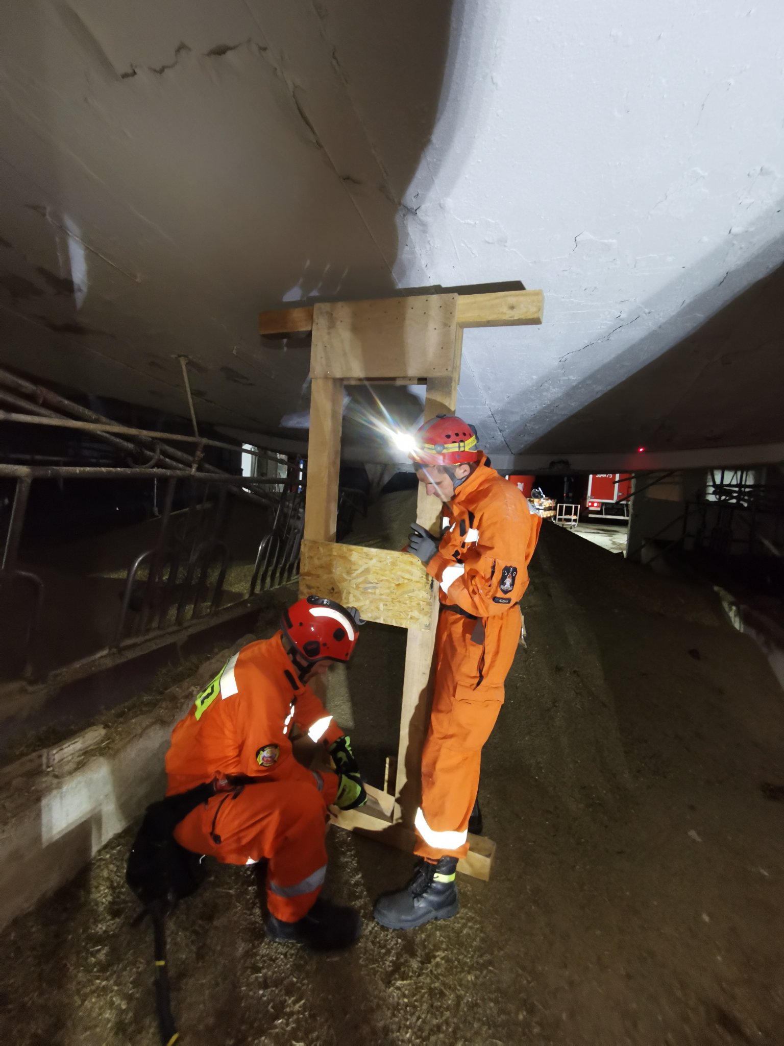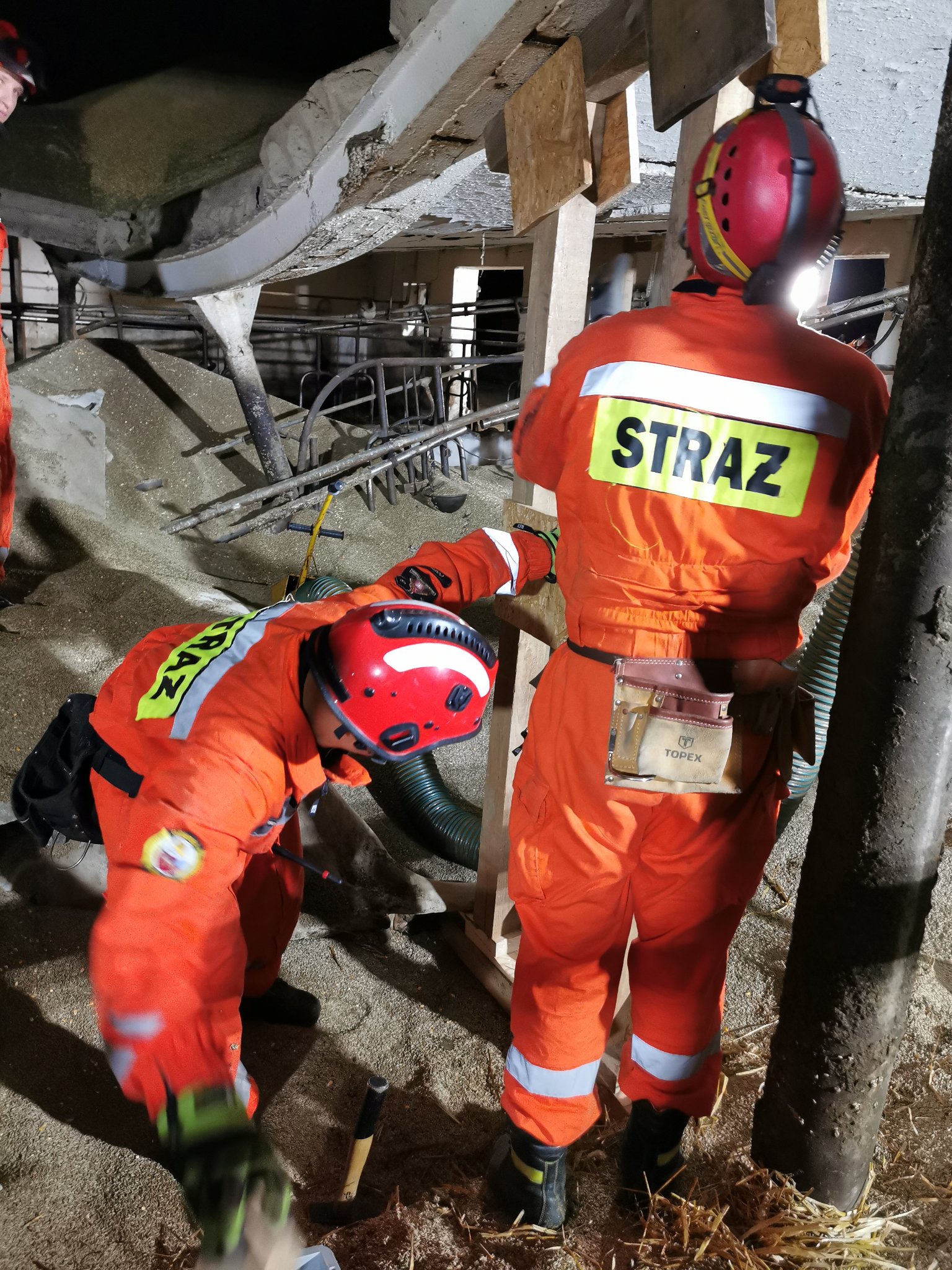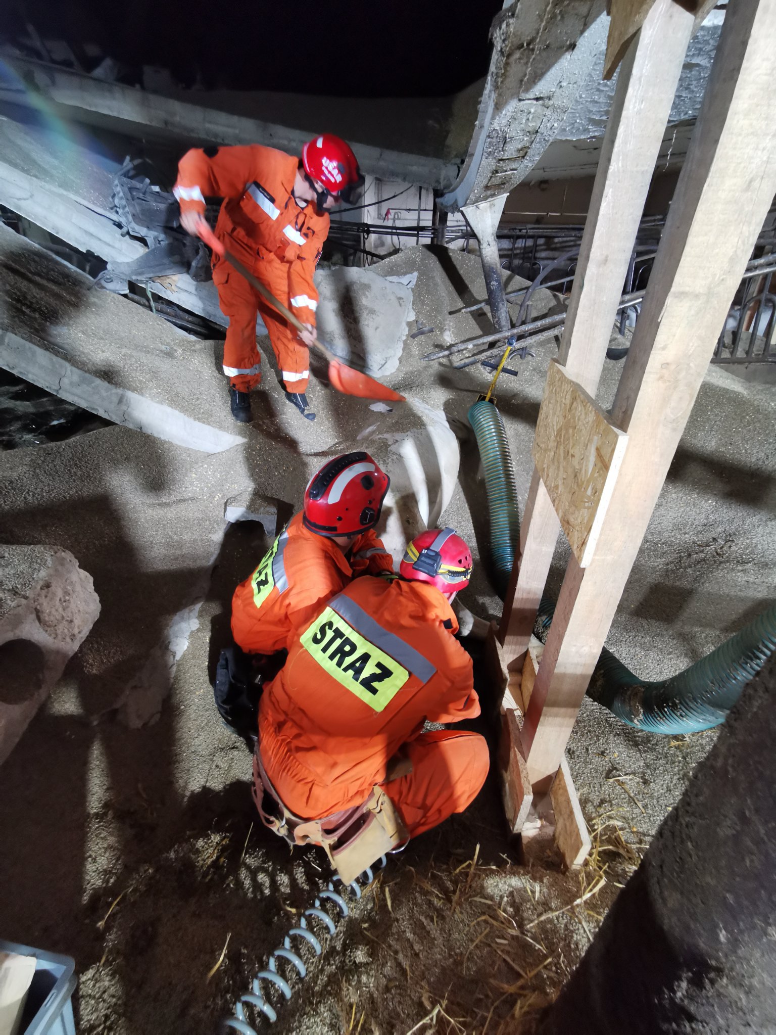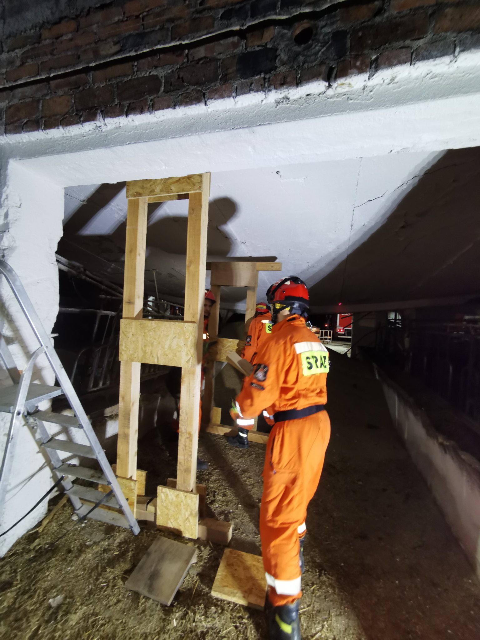 Jedna krowa wciąż znajdowała się pod zawalonym stropem przysypana dużą ilością zboża. Wejście w to miejsce było bardzo niebezpieczne - istniało ryzyko dalszego zawalenia stropu, tym bardziej przy wykonywaniu gwałtownych ruchów, które były konieczne do wyciągnięcia uwięzionego zwierzęcia.