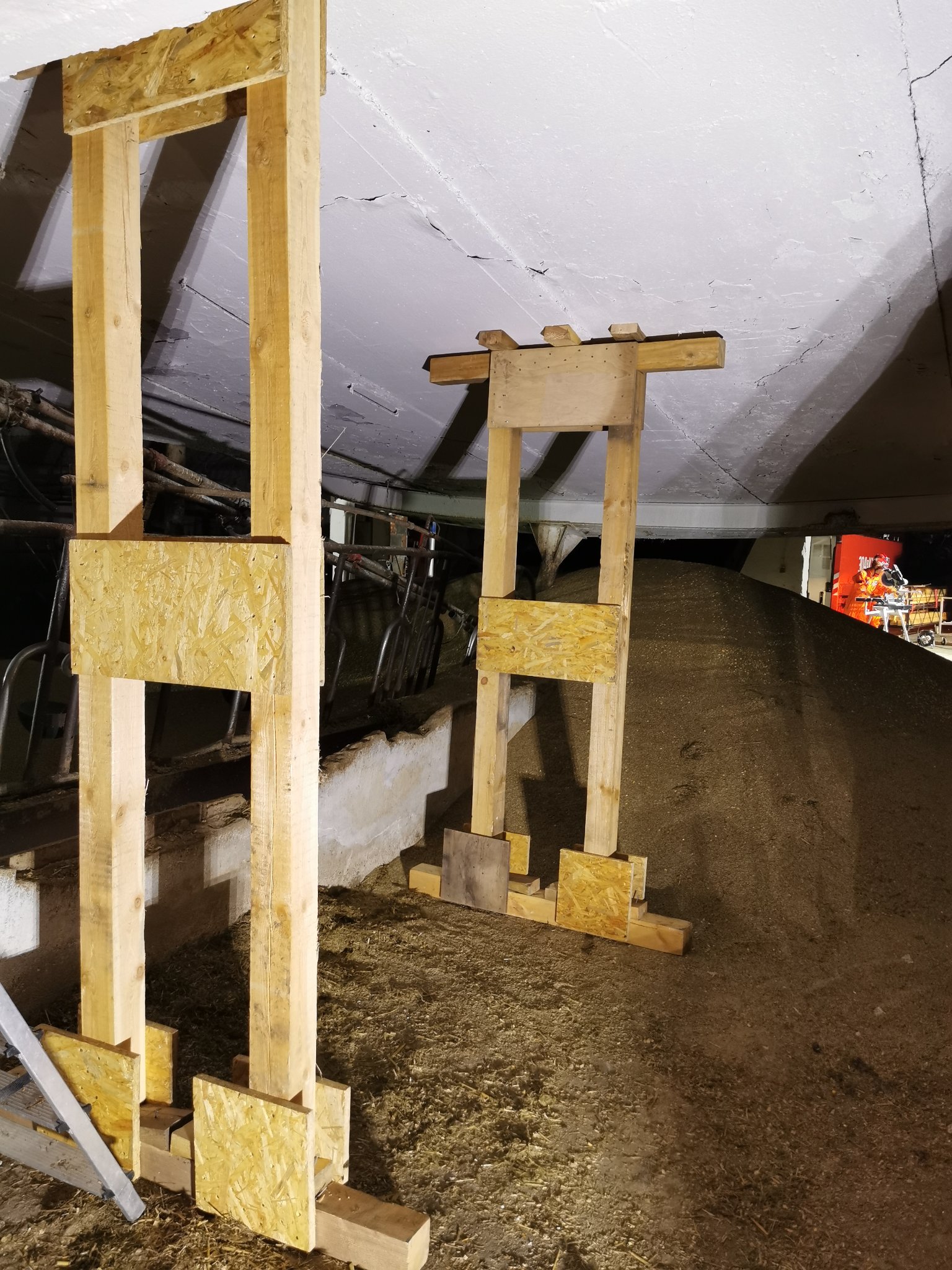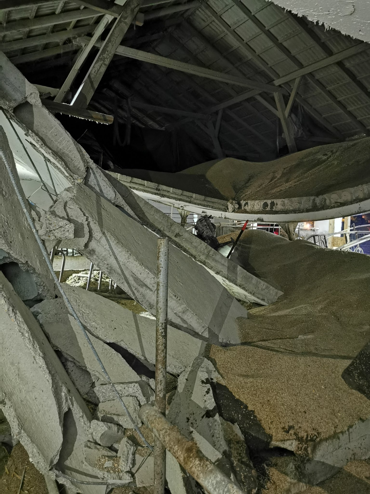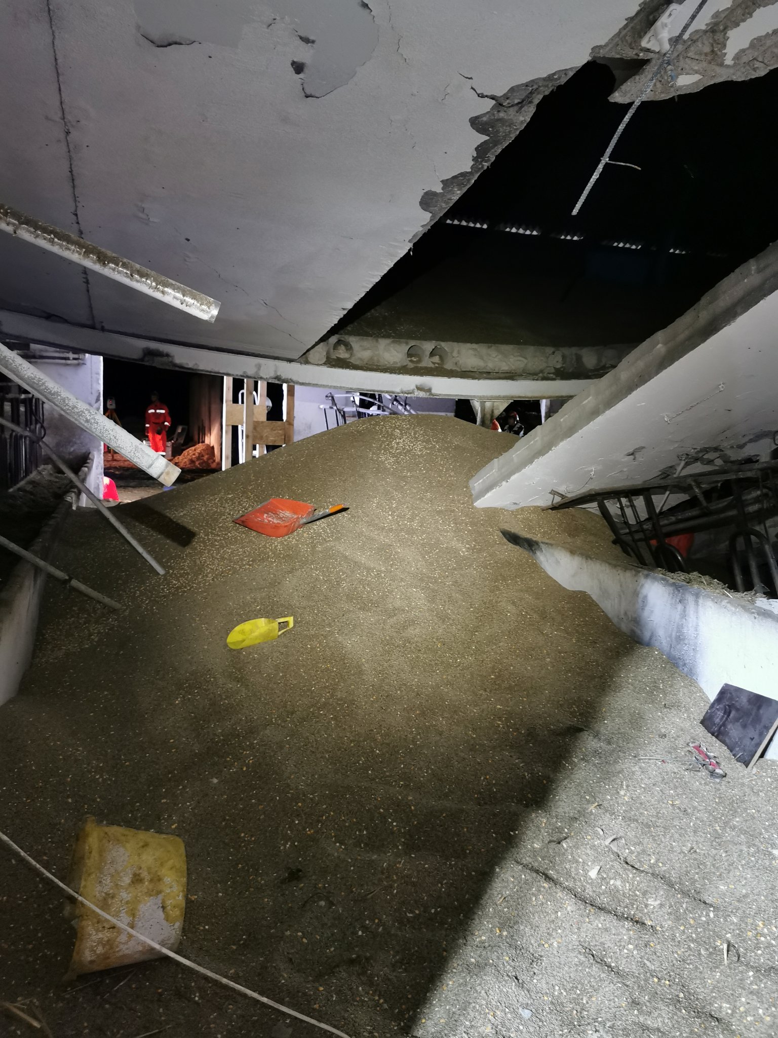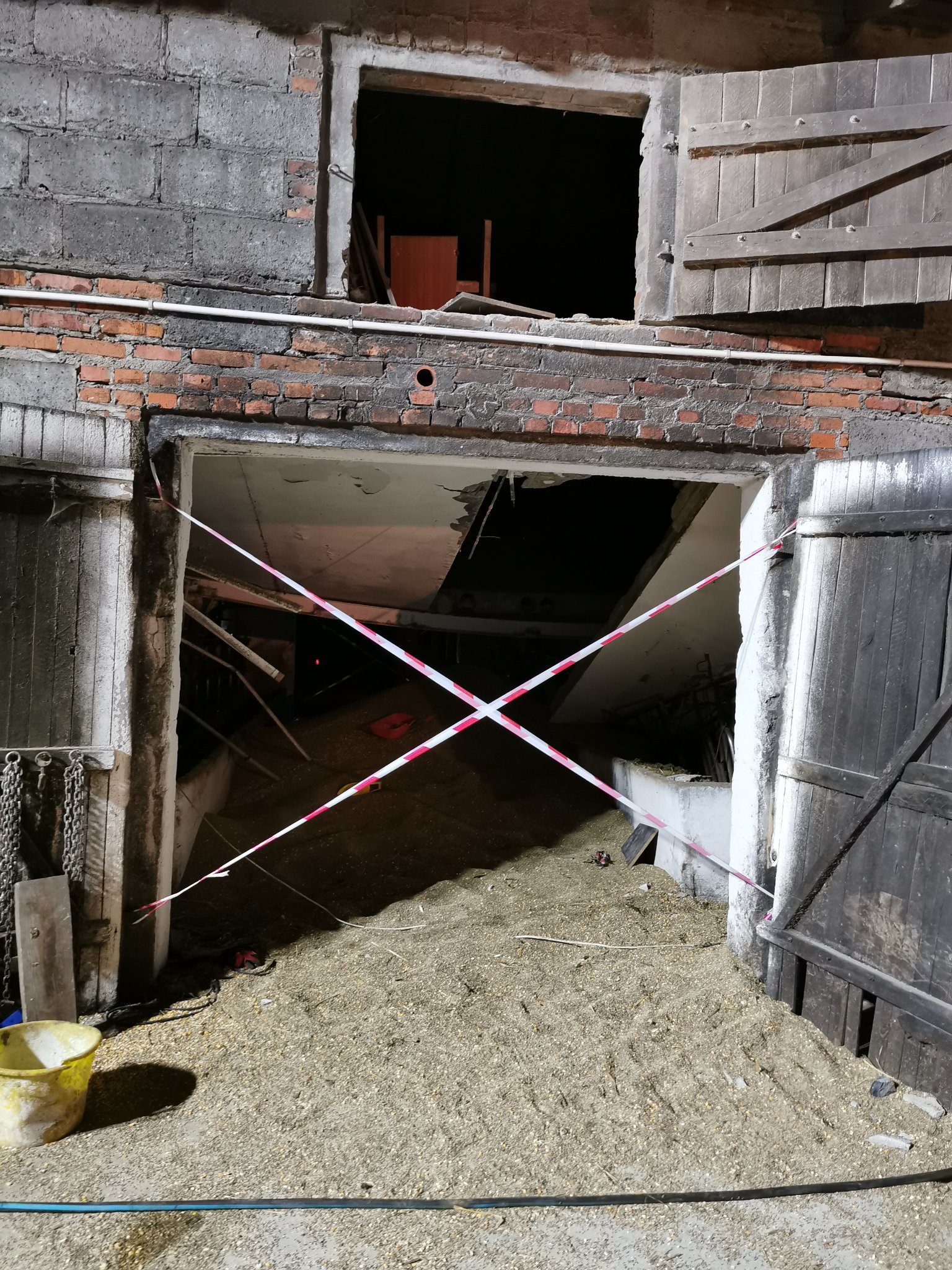 Jedna krowa wciąż znajdowała się pod zawalonym stropem przysypana dużą ilością zboża. Wejście w to miejsce było bardzo niebezpieczne - istniało ryzyko dalszego zawalenia stropu, tym bardziej przy wykonywaniu gwałtownych ruchów, które były konieczne do wyciągnięcia uwięzionego zwierzęcia.