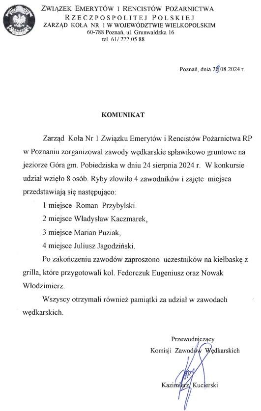 Zarząd koła numer jeden Związku Emerytów i Rencistów Pożarnictwa RP przy komendzie miejskiej PSP w Poznaniu. Organizuje zawody wędkarskie. W dniu 24.08.2024 r. o godzinie 10:00 na jeziorze Góra gmina Pobiedziska. Zbiórka godzina 9:00 Góra 50. Chętnych do uczestnictwa. Przyjmuje kolega. Kolega Kaczmarek. Tel 501 413 489 oraz Kazimierz Kucierski 600 179 242 do dnia 10 08.2024 r.