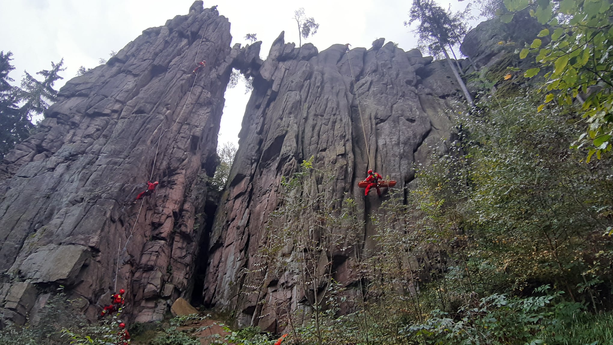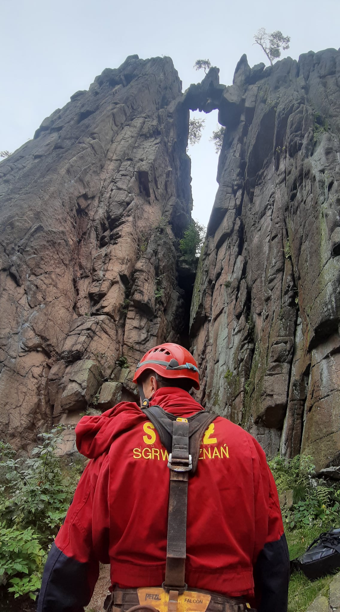 - pozorowaną akcję ratowniczą w przygodnym terenie z ekspozycją ratowników na poziomie 60 metrów,