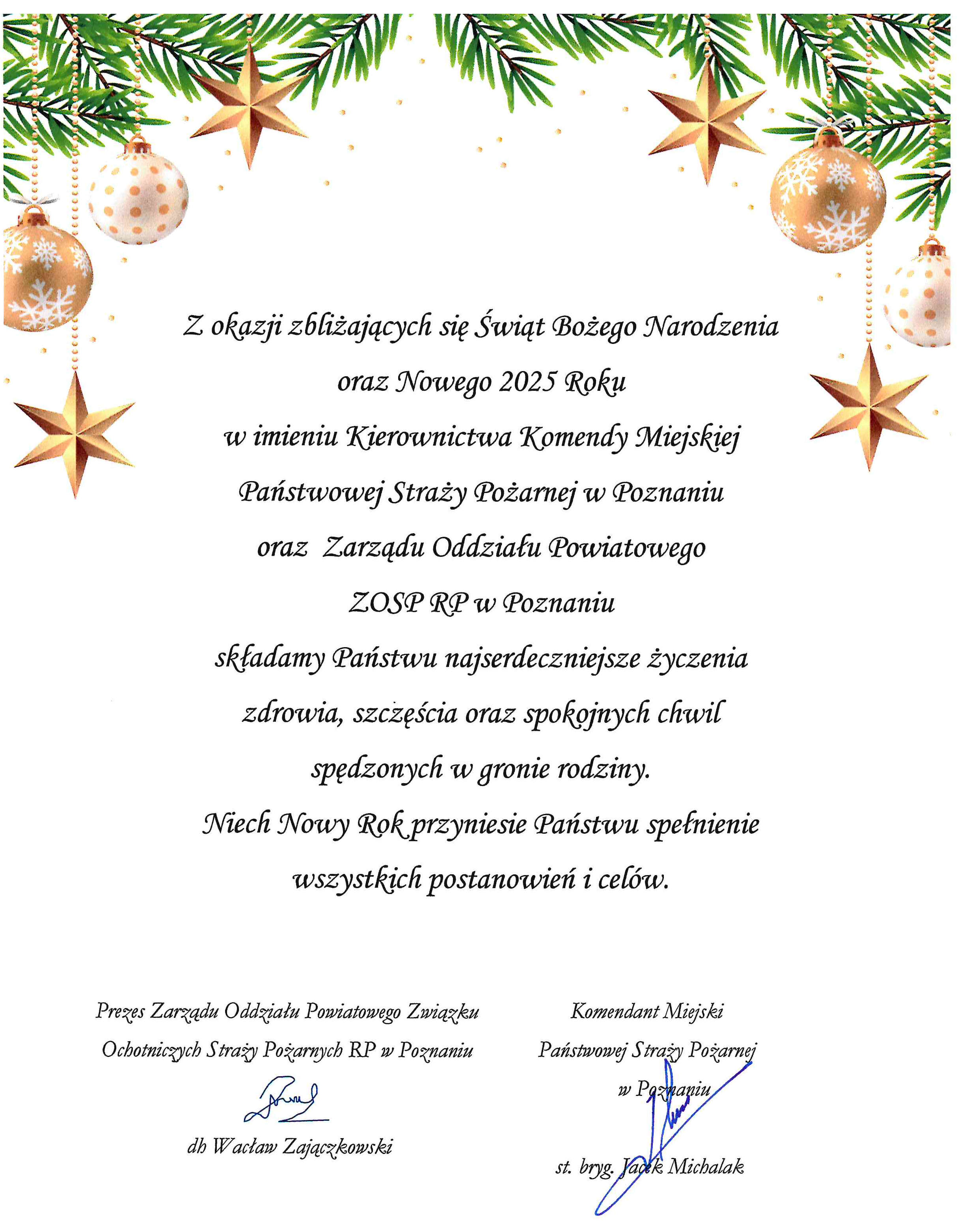 Życzenia Komendanta Miejskiego Państwowej Straży Pożarnej oraz Prezesa Ochotniczych Straży Pożarnych w Poznaniu z okazji świąt Bożego Narodzenia