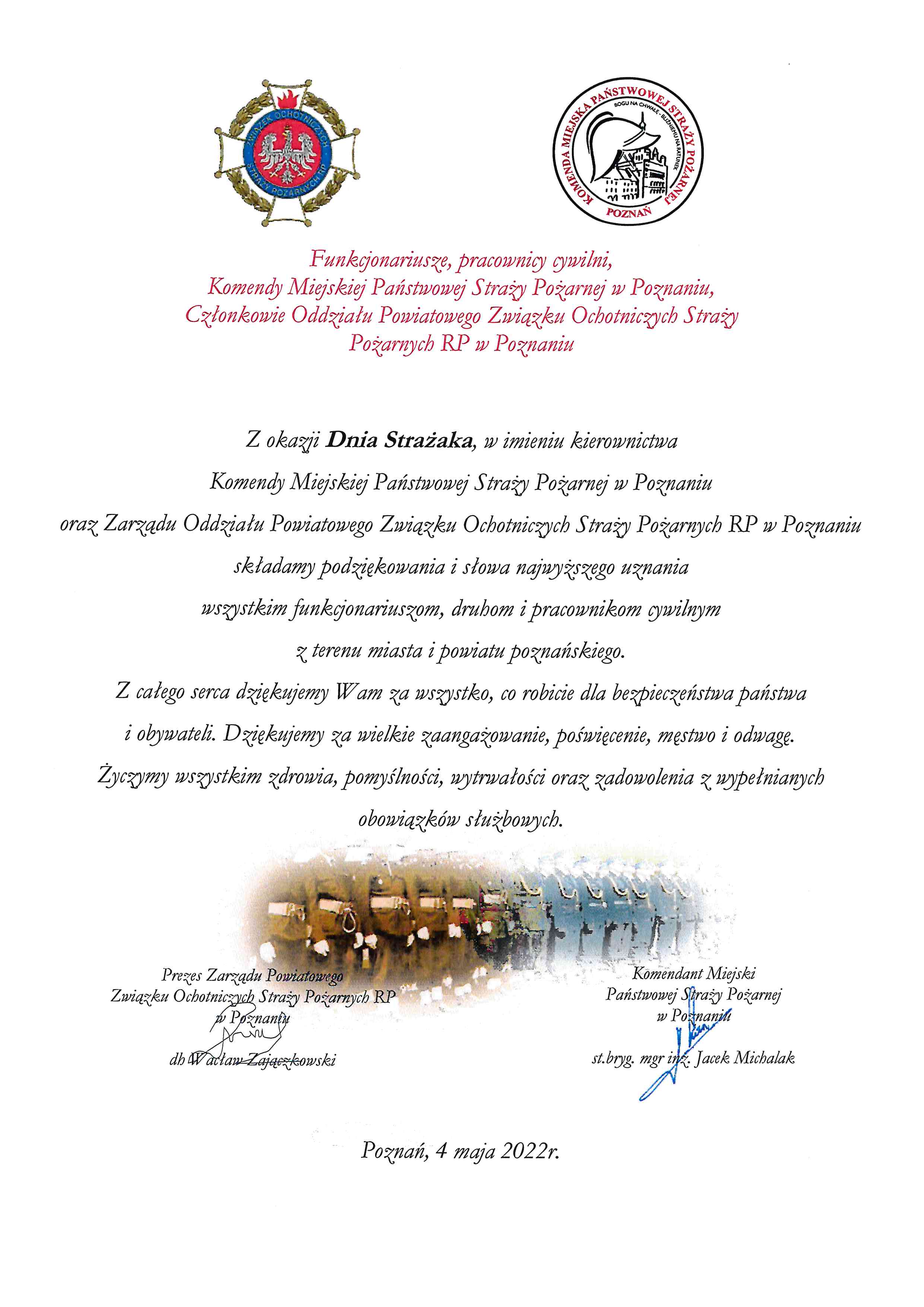 ŻYCZENIA KOMENDANTA MIEJSKIEGO PSP W POZNANIU Z OKAZJI DNIA STRAŻAKA