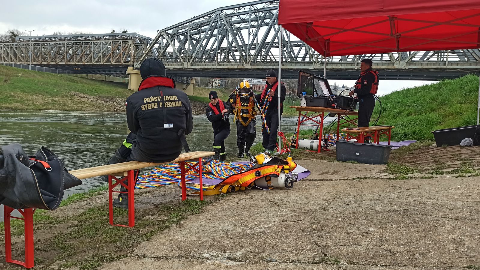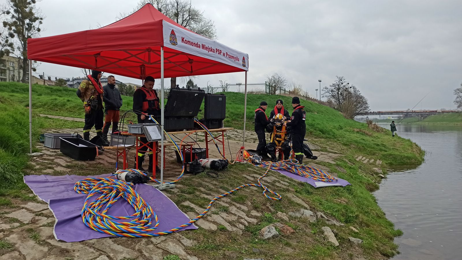 Pierwszego kwietnia br. Specjalistyczna Grupa Ratownictwa Wodno-Nurkowego z Komendy Miejskiej PSP w Przemyślu, odbyła ćwiczenia doskonalące na rzece San. Scenariusz ćwiczeń zakładał doskonalenie technik nurkowych w wodach płynących z wykorzystaniem zestawu dla dwóch nurków do działań w wodach skażonych i zanieczyszczonych. W trakcie ćwiczeń omówiono procedury dotyczące użycia nurkowego sprzętu przewodowego z hełmami Kirby-Morgan do prac podwodnych, jak również praktyczne sprawdzanie swoich umiejętności przy różnych prędkościach płynącej wody.