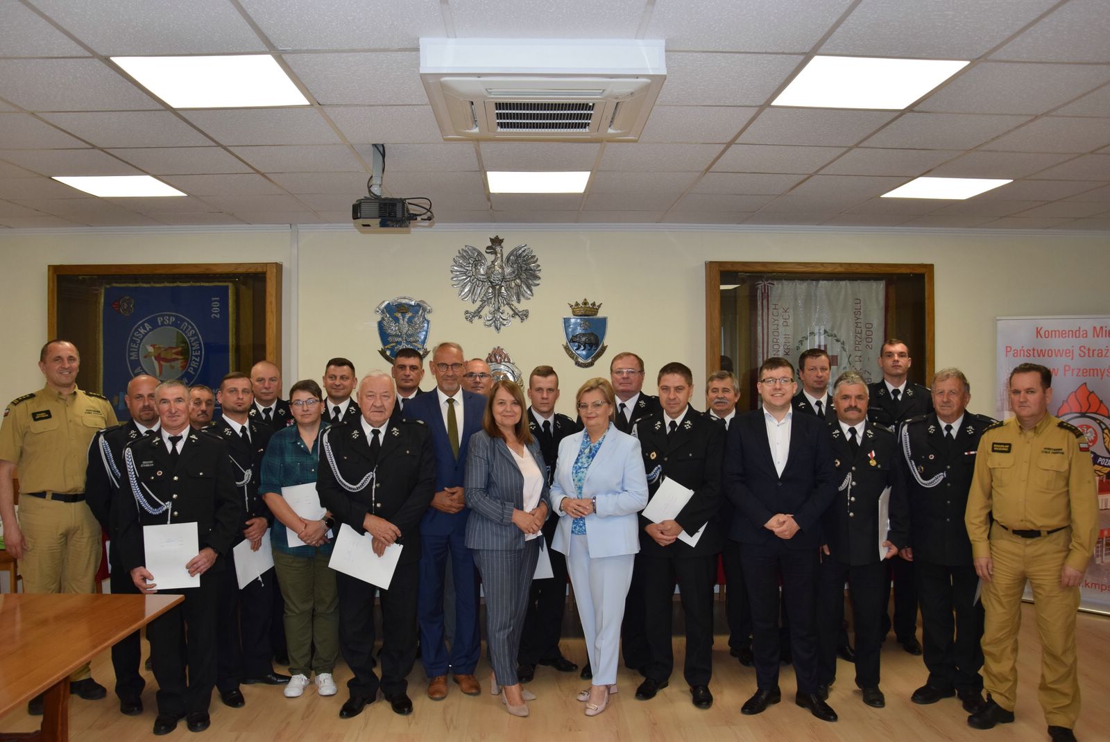 W uroczystym wręczeniu umów uczestniczyli: Pani Teresa Pamuła posłanka na sejm RP, st. bryg. Daniel Dryniak zastępca podkarpackiego komendanta wojewódzkiego PSP, Pan Adam Skiba Prezes Zarządu Wojewódzkiego Funduszu Ochrony Środowiska i Gospodarki Wodnej w Rzeszowie, Pan Mariusz Król radny sejmiku województwa podkarpackiego, Pani Bożena Ryczan wiceprzewodnicząca rady powiatu przemyskiego, Pan Arkadiusz Mazur radny powiatu przemyskiego oraz st. bryg. Bogusław Szczurko komendant miejski PSP w Przemyślu.