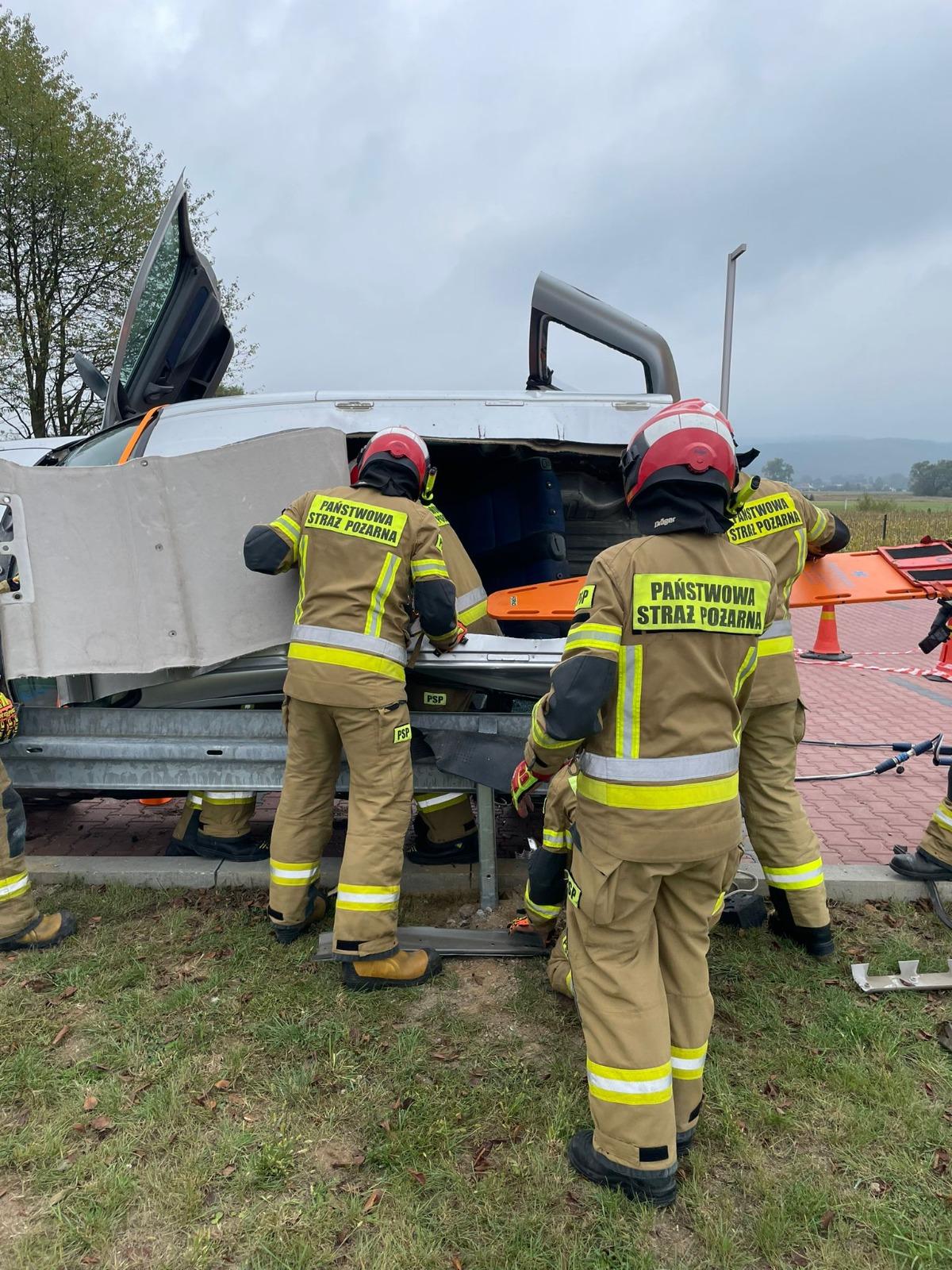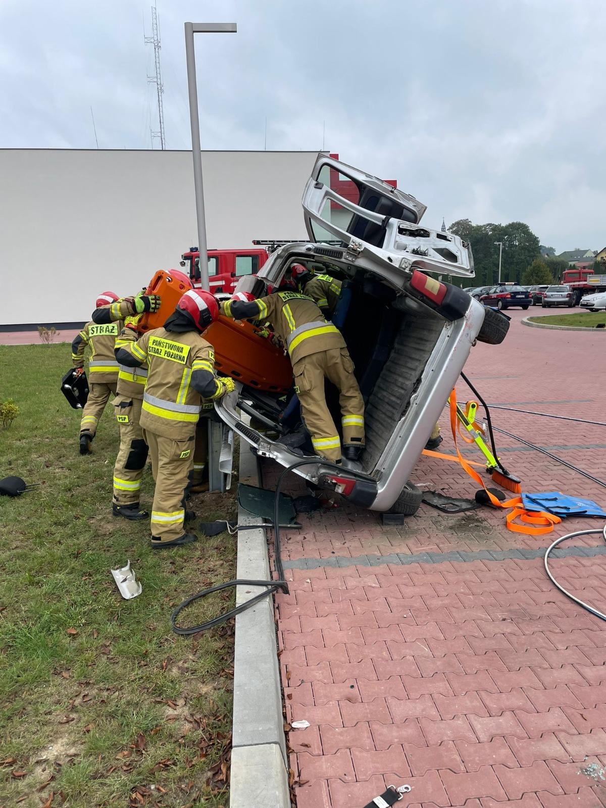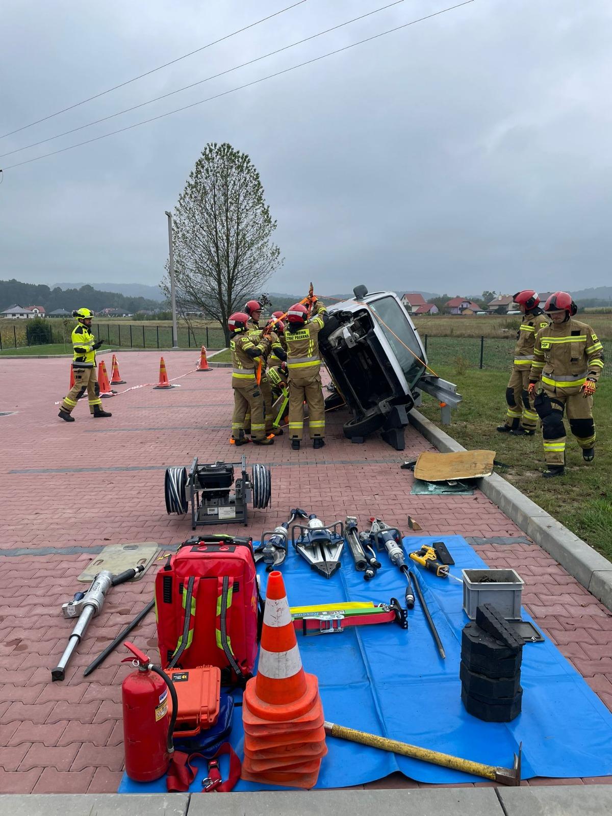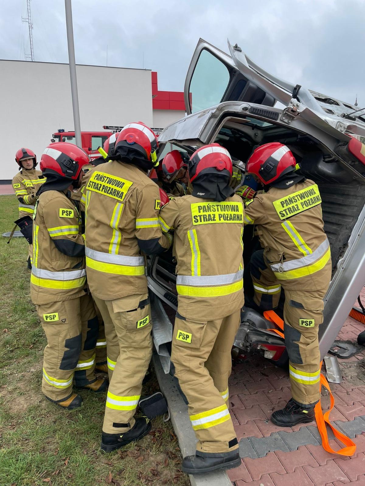 Następnie przystąpiono do wykonywania założeń praktycznych na specjalnie przygotowanym do tego celu stanowisku ćwiczebnym zorganizowanym przez I zmianę służbową tut. JRG. W pierwszej kolejności przećwiczono techniki stabilizacji pojazdów z użyciem zestawu klinów oraz podpór ratowniczych. Następnie przećwiczono pracę hydraulicznymi zestawami ratowniczymi z jednoczesnym udzielaniem Kwalifikowanej Pierwszej Pomocy osobie poszkodowanej wraz z technikami ewakuacji jej z pojazdów. Na koniec odbyło się podsumowanie, podczas którego wyciągnięto wiele przydatnych i merytorycznych wniosków, które zaprocentują w przyszłości.