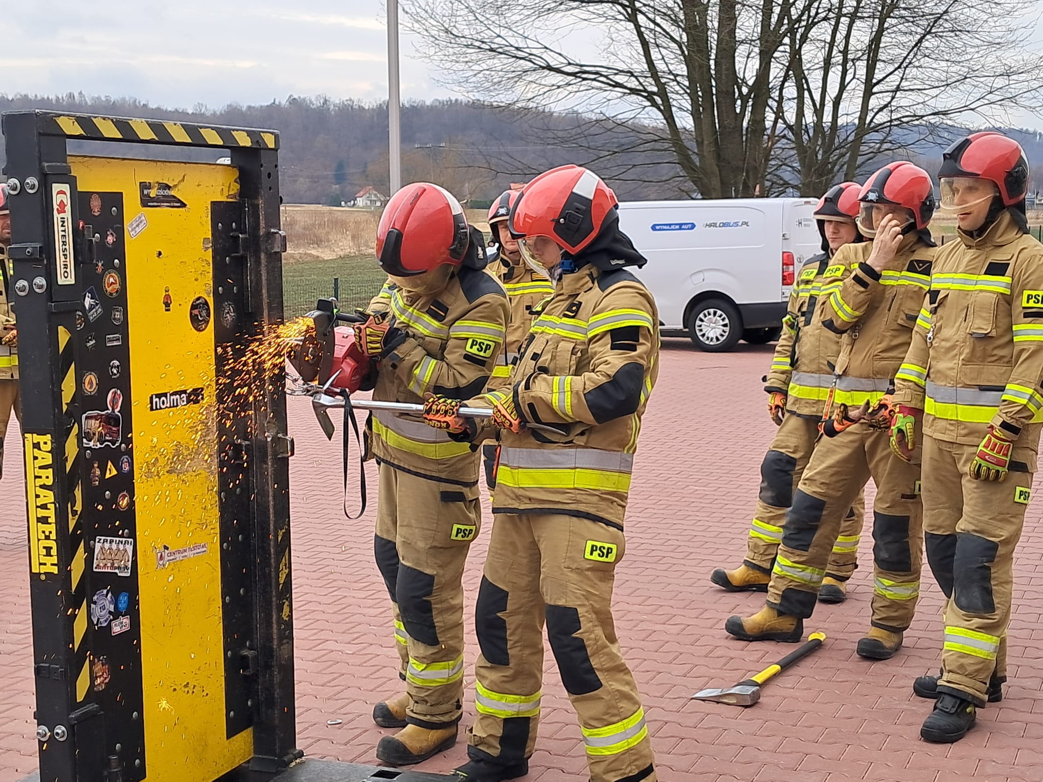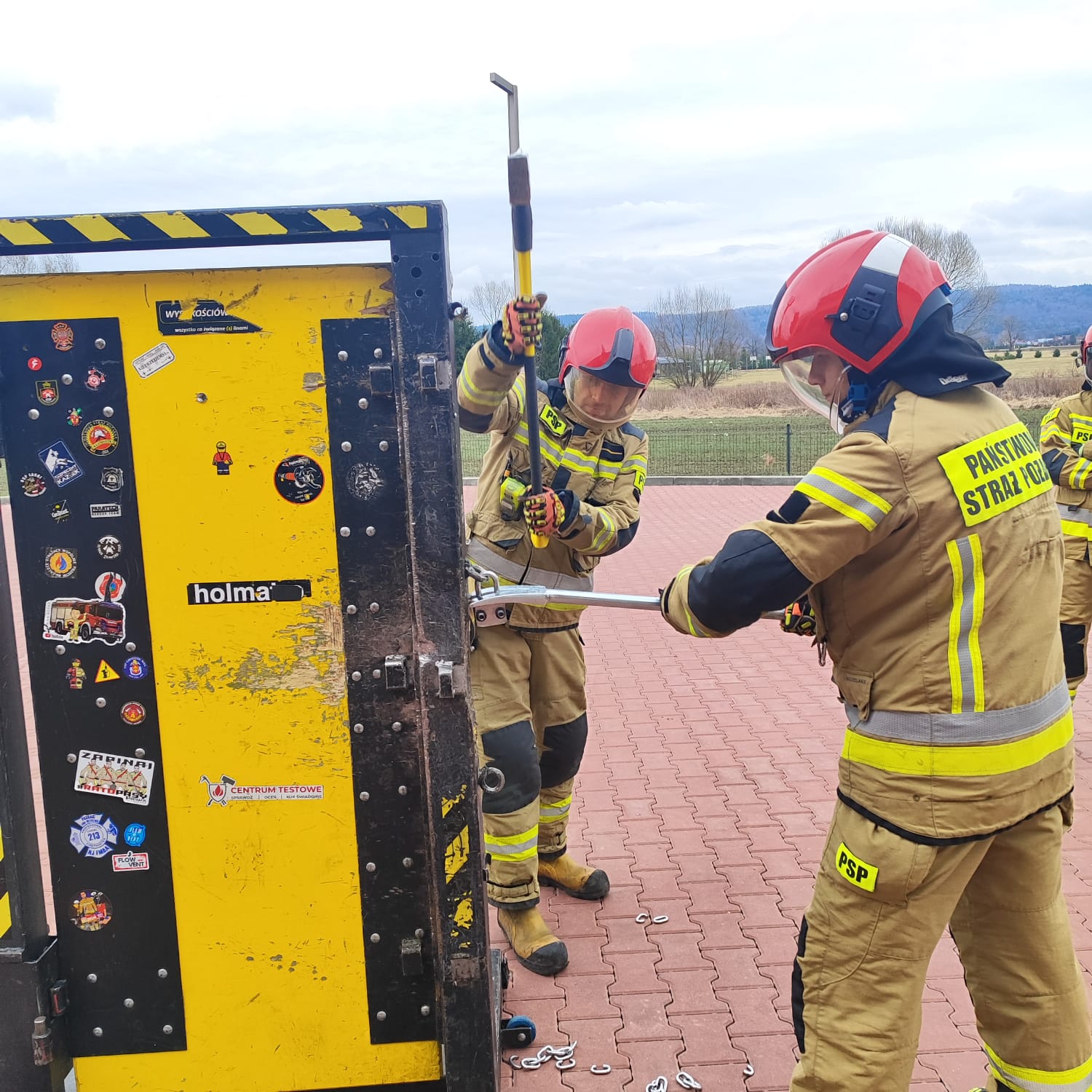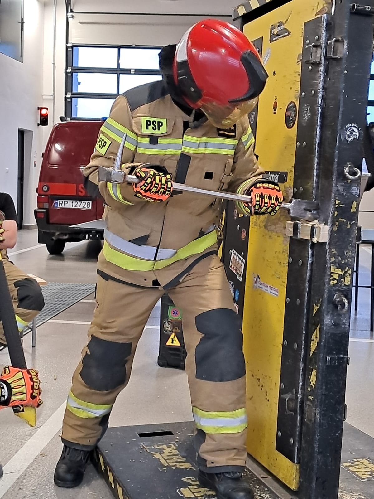 W trakcie długiej i wymagającej praktyki strażacy obu jednostek mieli możliwość ćwiczyć na wielu rodzajach sprzętu zaczynając od młota i Hooligan’a, a kończąc na specjalistycznym urządzeniu do wyłamywania wkładek w drzwiach.