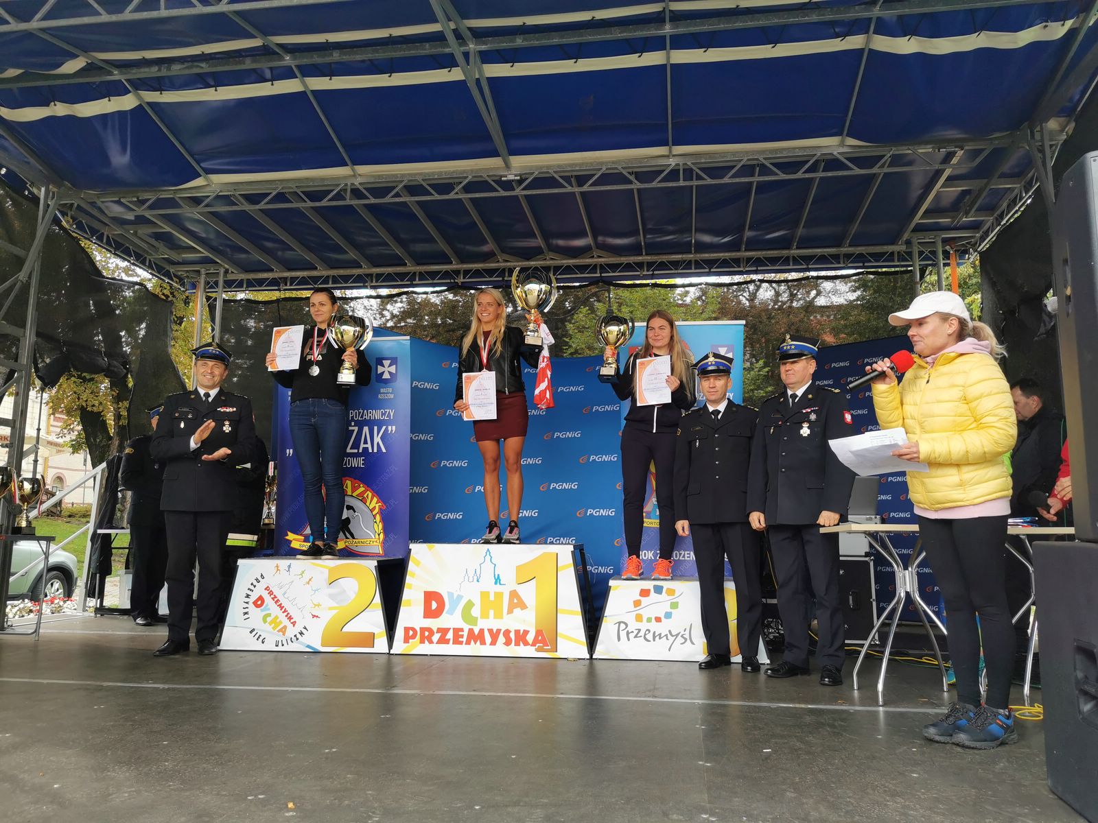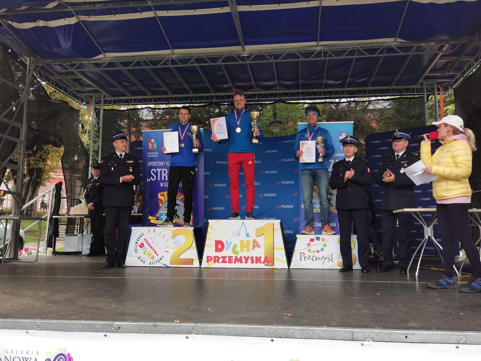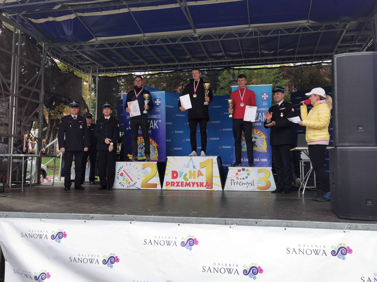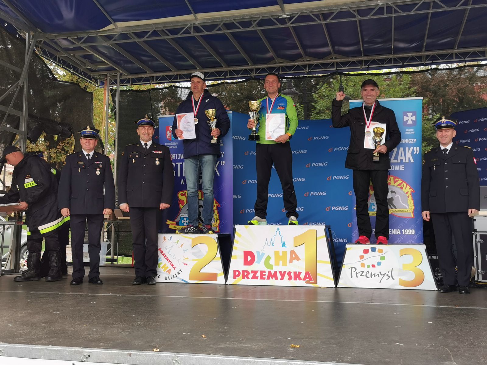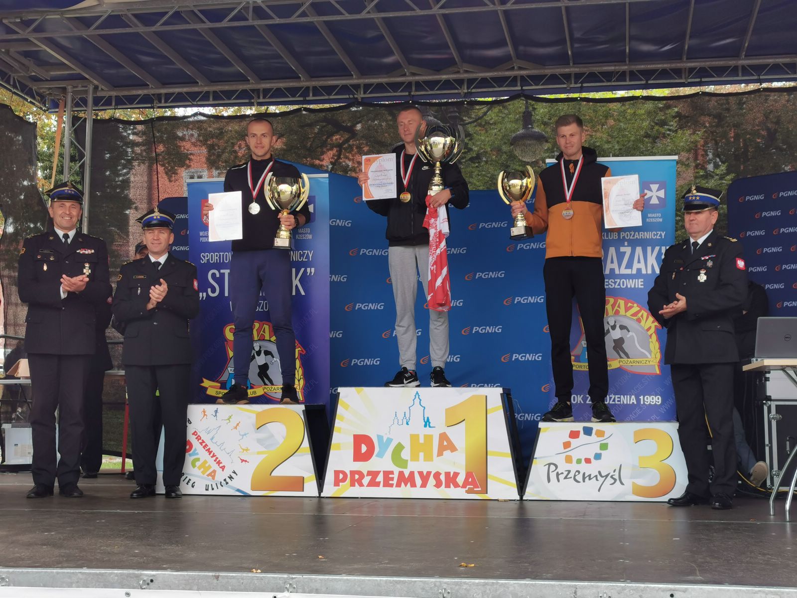 Najlepszym strażakom wręczyli puchary i złożyli gratulacje st. bryg. Daniel Dryniak zastępca podkarpackiego komendanta wojewódzkiego PSP, st. bryg. Bogusław Szczurko komendant miejski PSP w Przemyślu, bryg. Szymon Ławecki z Biura Edukacji Komendy Głównej PSP oraz mł. kpt. Tomasz Szymański członek zarządu Sportowego Klubu Pożarniczego „Strażak” w Rzeszowie.