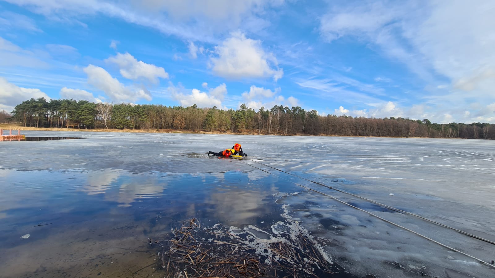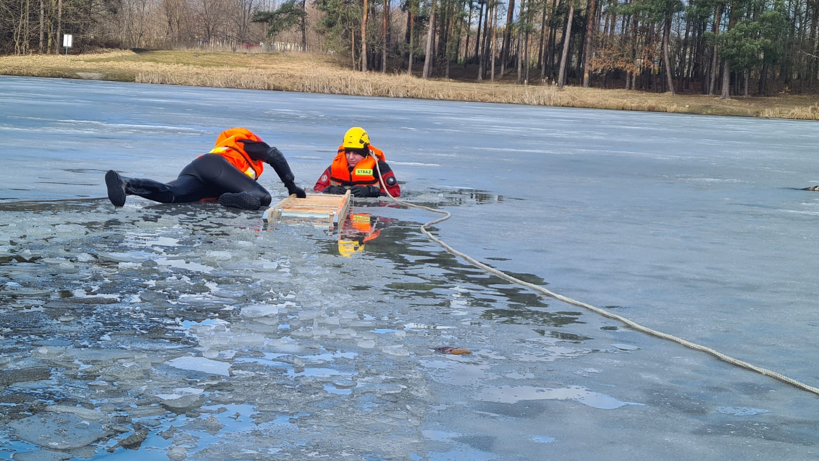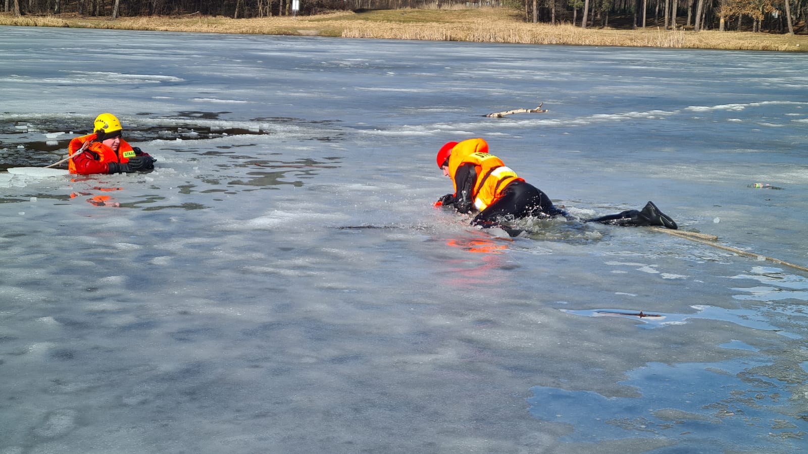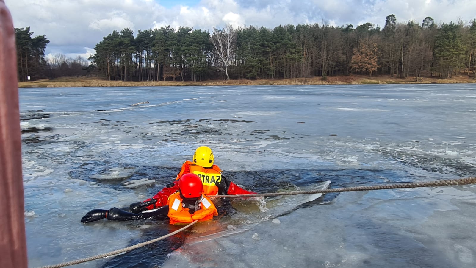 akwenach wodnych pokrytych lodem. Strażacy biorących udział w ćwiczeniach zostali zapoznani z zasadami bezpieczeństwa podczas działań na zamarzniętych akwenach wodnych. Podczas ćwiczeń doskonalono techniki dotarcia do osoby poszkodowanej, podejmowaniu osób z wody oraz