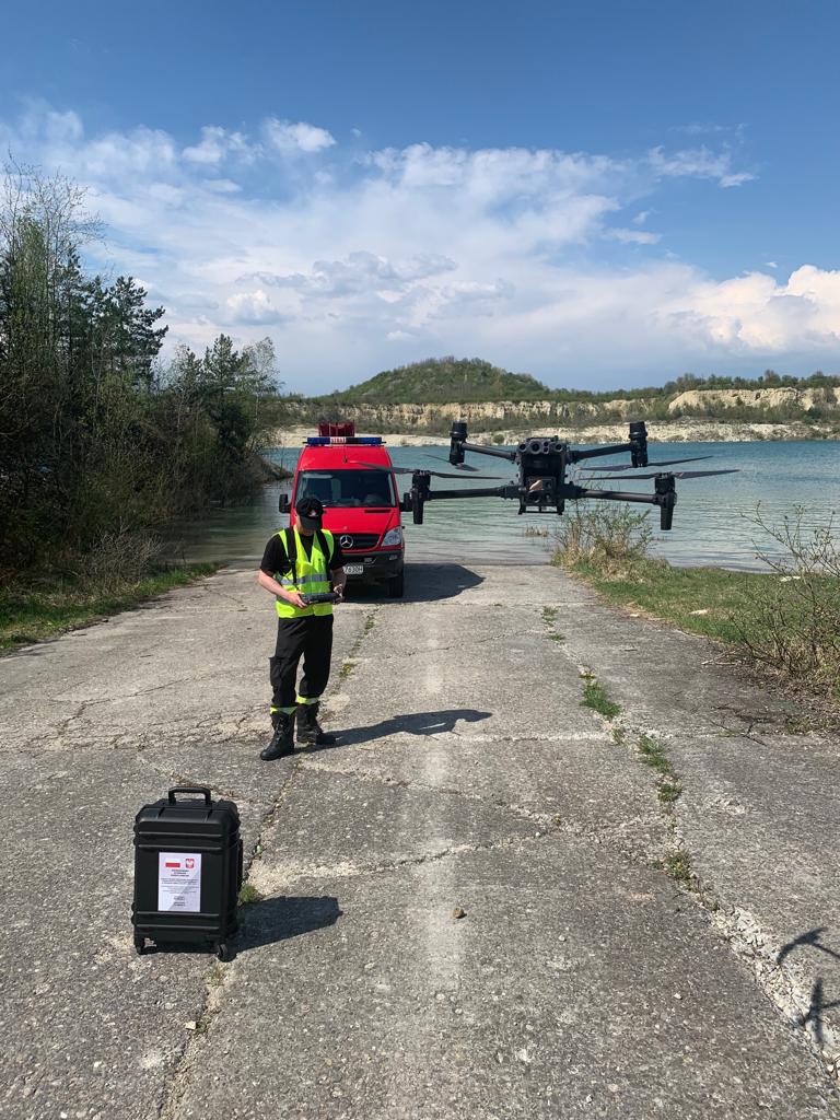 Ponadto podczas ćwiczeń dokonano sprawdzenia zbiornika wodnego dronem pod kątem występowania śniętych ryb, plam oleju i innych zagrożeń.