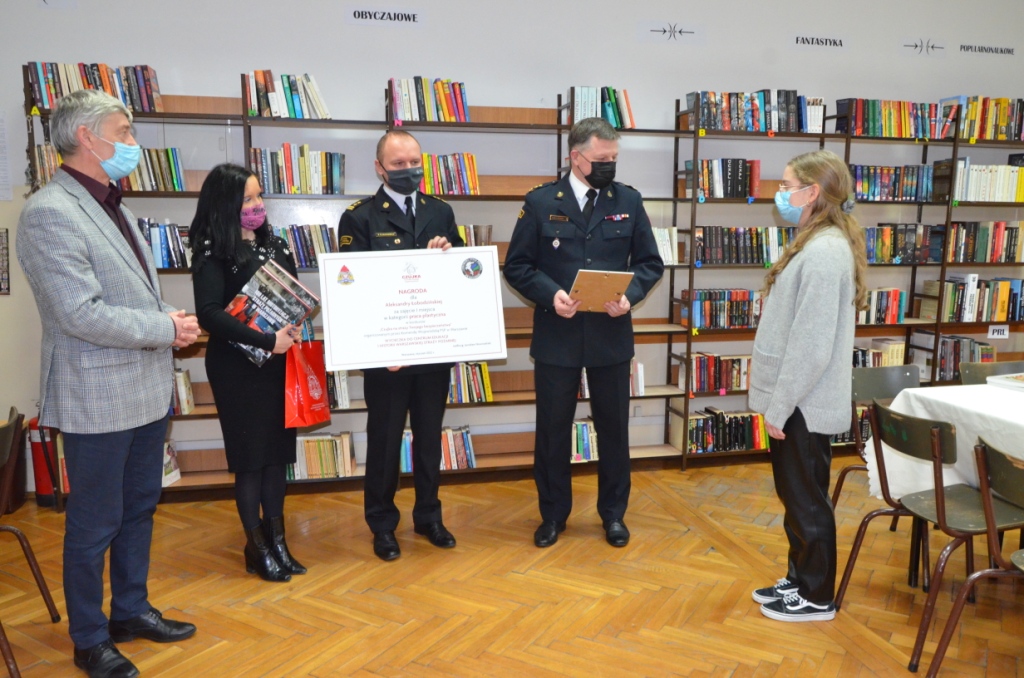 Nagrodami za zajęcie I miejsca były wycieczka do Centrum Edukacji i Historii Warszawskiej Straży Pożarnej, zwiedzanie Zamku Królewskiego w Warszawie, dyplom, nagrody książkowe oraz gadżety. Nagrody te w asyście Komendanta Miejskiego PSP w Radomiu bryg. Pawła Fliszkiewicza wręczyli: