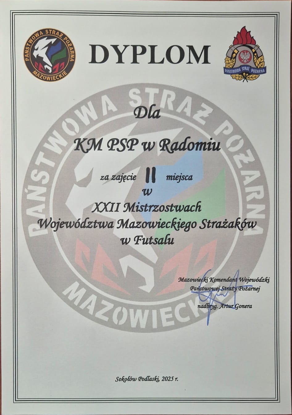 21 marca 2025 roku w Hali Sportowej w Sokołowie Podlaskim przy ul. Marii Skłodowskiej-Curie oraz w Szkole Podstawowej nr 1 im. Janusza Kusocińskiego w Sokołowie Podlaskim rozegrana została faza finałowa XXII Mistrzostw Województwa Mazowieckiego Strażaków w Halowej Piłce Nożnej. W sportowej rywalizacji zmierzyło się 8 najlepszych drużyn reprezentujących Komendy Państwowej Straży Pożarnej z terenu województwa mazowieckiego.