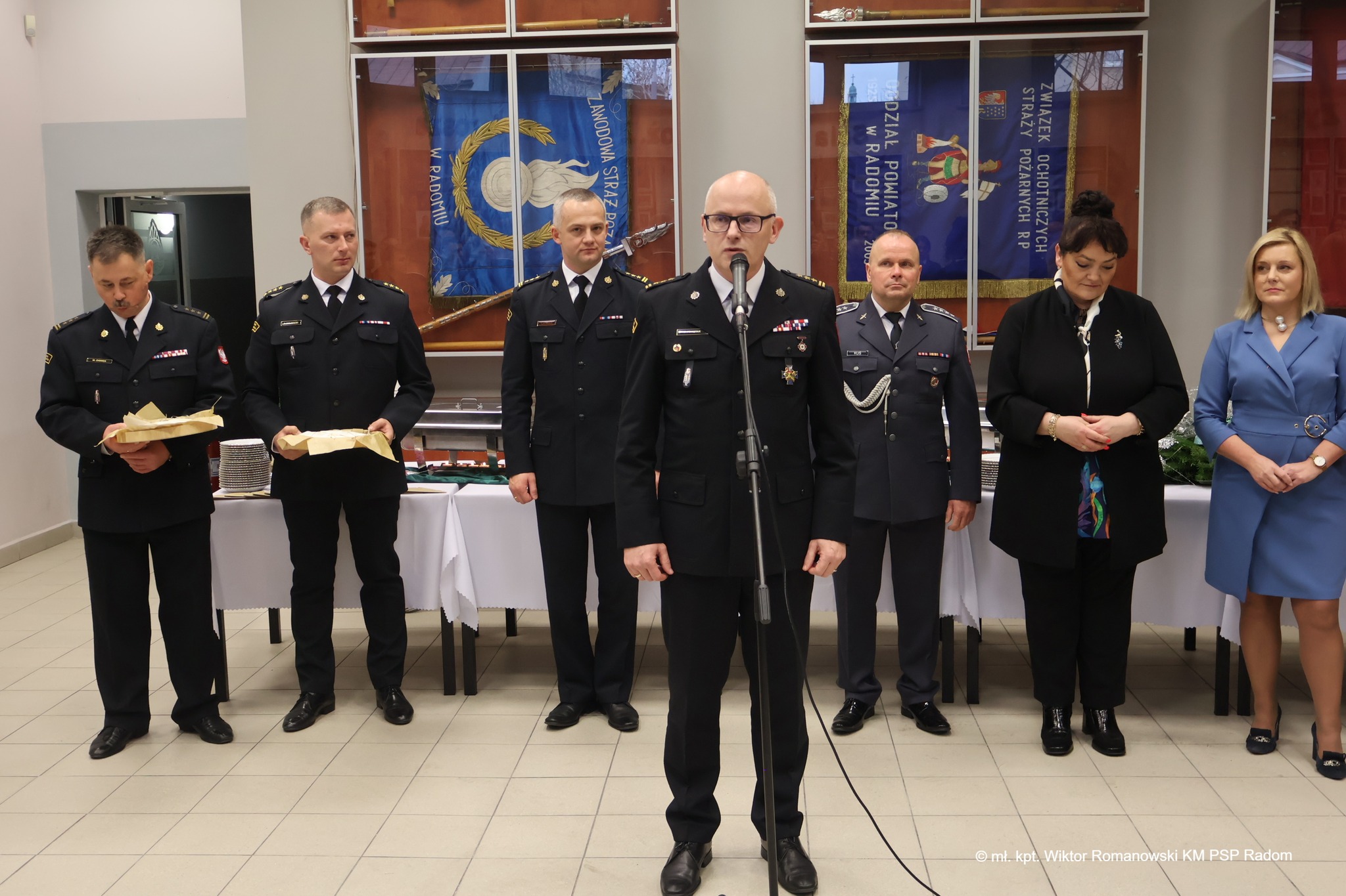 Spotkanie oficjalnym przemówieniem rozpoczął st. bryg. Łukasz Szymański Komendant Miejski Państwowej Straży Pożarnej w Radomiu witając zaproszonych gości, funkcjonariuszy, strażaków i pracowników Komendy Miejskiej PSP w Radomiu. W imieniu własnym i zastępców przekazał wszystkim funkcjonariuszom, pracownikom cywilnym oraz ich rodzinom życzenia Bożonarodzeniowe i noworoczne, a także podziękował za zaangażowanie w pracę w ciągu całego, mijającego roku.