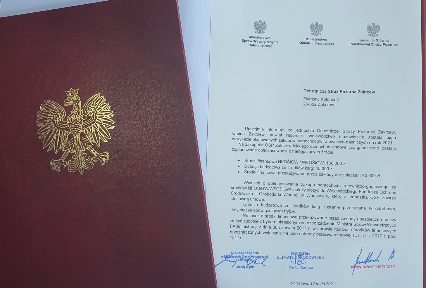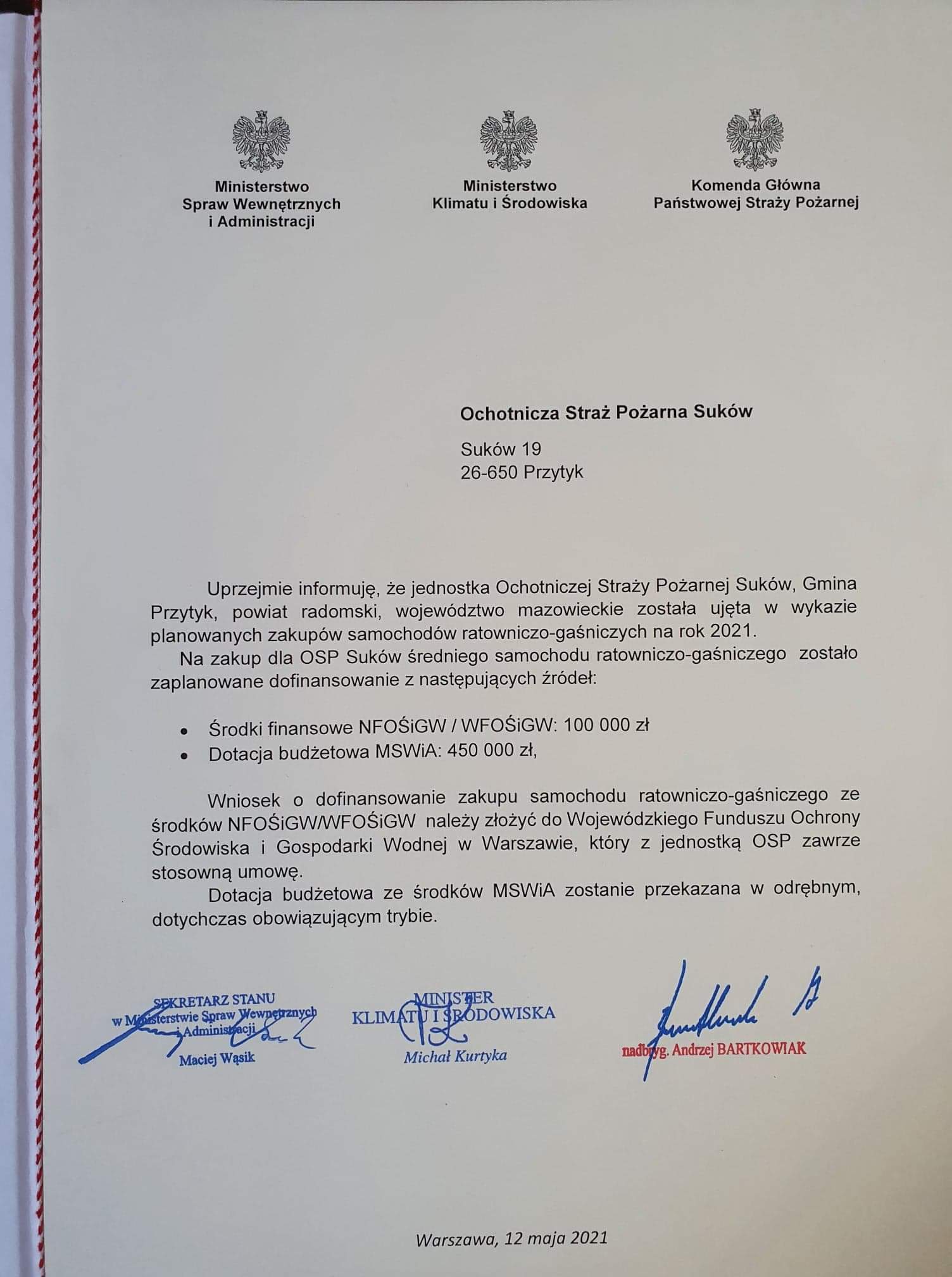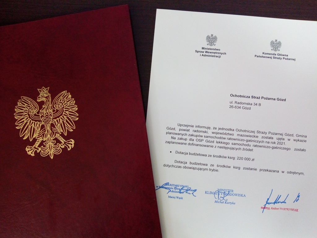 Dzięki zaangażowaniu Ministra Spraw Wewnętrznych i Administracji – Mariusza Kamińskiego, Wiceministra Spraw Wewnętrznych i Administracji – Macieja Wąsika, Komendanta Głównego Państwowej Straży Pożarnej – nadbryg. Andrzeja Bartkowiaka oraz Mazowieckiego Komendanta Wojewódzkiego Państwowej Straży Pożarnej - nadbryg. Jarosława Nowosielskiego udało się pozyskać oraz przekazać środki finansowe na zakup nowych pojazdów ratowniczo – gaśniczych do 24 jednostek Ochotniczych Straży Pożarnych jak również włączyć kolejne 2 jednostki OSP do krajowego systemu ratowniczo - gaśniczego.