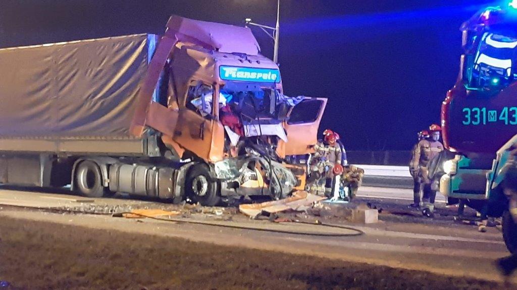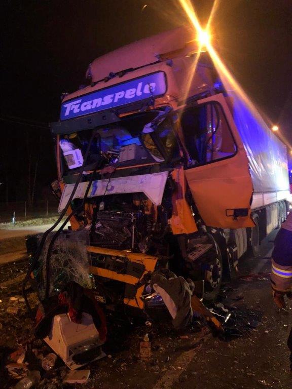 Po dojeździe na miejsce zdarzenia pierwszych zastępów, ratownicy zastali zderzenie dwóch samochodów ciężarowych. Jedna z ciężarówek wjechała w tył naczepy innego samochodu ciężarowego stojącego przed przejściem dla pieszych na skrzyżowaniu. W wyniku zdarzenia kierujący pojazdem, który uderzył w tył drugiego pojazdu został uwięziony w kabinie.