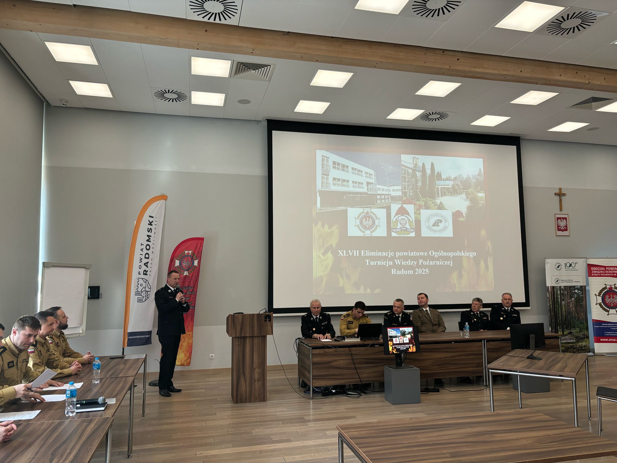 Turniej rozpoczął się przywitaniem wszystkich uczestników oraz przybyłych gości przez Prezesa Zarządu Oddziału Powiatowego ZOSP RP w Radomiu dh Pawła Tuzinka: Komendanta Miejskiego PSP w Radomiu st. bryg. Łukasza Szymańskiego, p.o. Zastępcę Komendanta Miejskiego Państwowej Straży Pożarnej w Radomiu mł. bryg. Konrada Neskę, członka Prezydium Zarządu Głównego Związku OSP RP dh Zbigniewa Gołąbka, z ramienia Nadleśnictwa Radom Pana Krzysztofa Kamińskiego, Regionalnej Dyrekcji Lasów Państwowych w Radomiu Panią Edytę Nowicką, Wiceprezesa Zarządu Oddziału Powiatowego ZOSP RP w Radomiu, a zrazem Zastępcę Burmistrza Jedlni – Letnisko dh Tomasza Siczka, Sekretarza Zarządu OP ZOSP RP w Radomiu dh Jerzego Garczyńskiego, Skarbnika Zarządu OP ZOSP w Radomiu dh Tomasza Kęskę, członków Zarządu OP ZOSP w Radomiu, Przewodniczącą Powiatowej Rady Opiekunów MDP dh Agatę Tkaczyk wraz z członkami Rady oraz Jury XLVII Ogólnopolskiego Turnieju Wiedzy Pożarniczej.