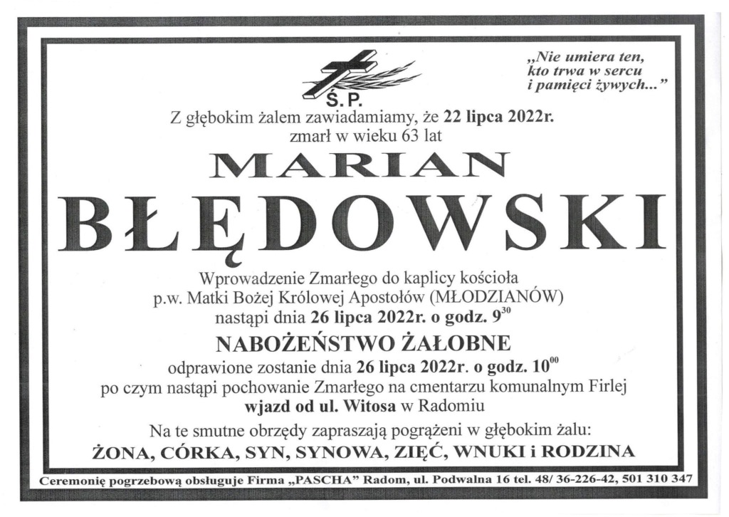 Z głębokim żalem zawiadamiamy o śmierci byłego pracownika naszej Komendy śp. asp. sztab. w st. spocz. Mariana Błędowskiego.